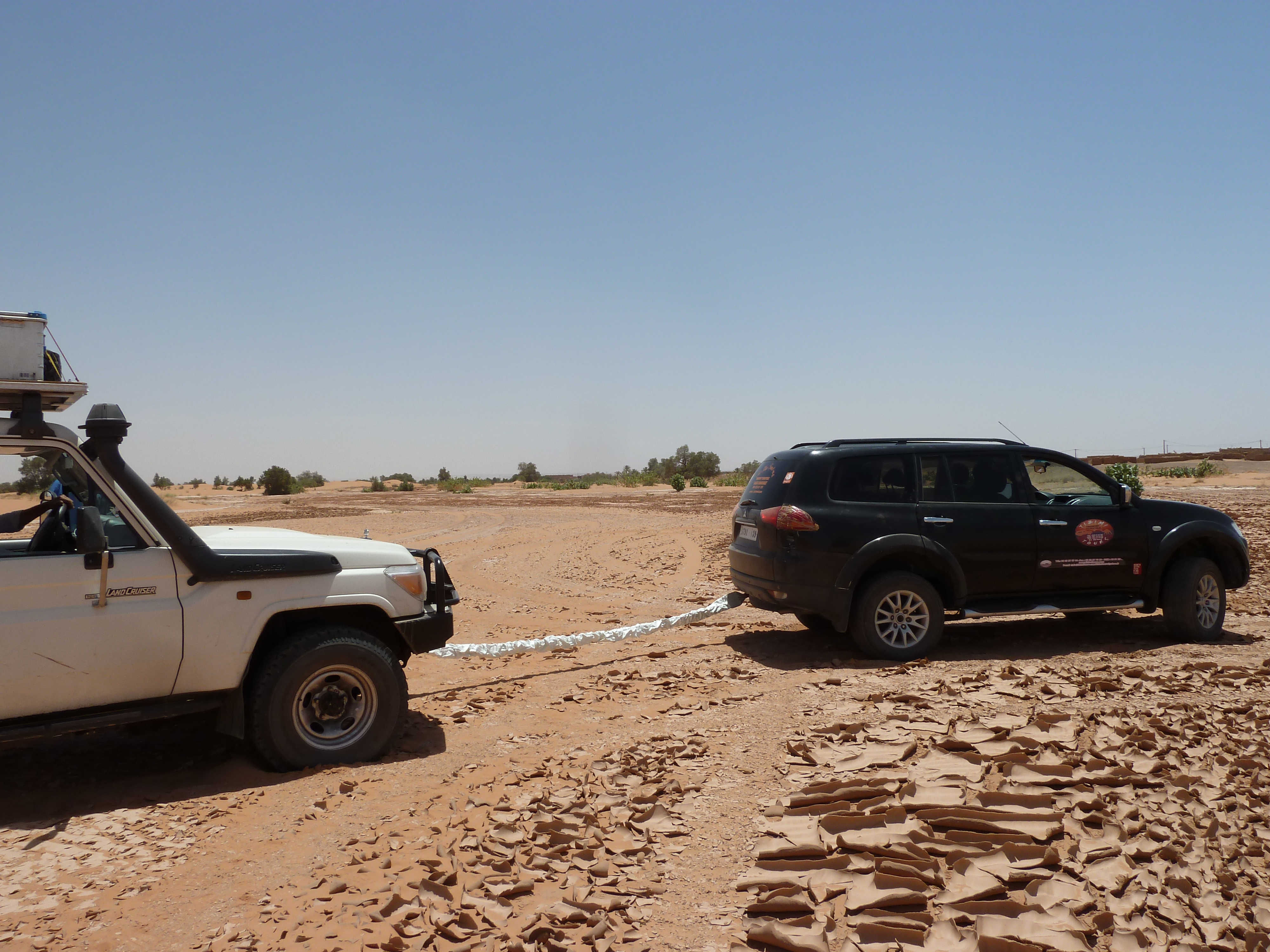 Die Nomaden ziehen jeweils weiter, wenn ihre Dromedare  – hier sind sie mit ganz dunklem Fell – alles abgegrast haben. Viel Nahrung ist allerdings nicht zu sehen. Die Berber leben von den Teppichen, die sie weben und/oder sticken, von der Wolle der Dromedare und Schafe in einer wirklich kargen, unwirtlichen Gegend. Kein anderes Haus weit und breit. Langsam sehen wir am Horizont die roten-gelben Dünen des Erg Chebbi. Eine Sanddüne nach der anderen. Immer wieder ist eine Fata Morgana in einiger Entfernung zu sehen. Wenn ich mir vorstelle, dass ich voller Hoffnung auf Wasser dahin marschieren würde und dann nichts – ich bekäme die Krise. Immer öfter kommen nun zwischen den Stein- auch Sandpisten. Paul muss recht arbeiten, manchmal im ersten Gang! Die Gegend verändert sich laufend, auf einmal werden die Steine grünlich. Man meint, in der Weite Gras zu sehen, doch alles sind nur Steine.  Auf den Hügeln haben sie militärische Festungen platziert, die Grenze zu Algerien ist nicht mehr weit, sicher ist sicher. Vor ca. zwei Wochen regnete es noch ziemlich heftig, verkrustete Oberflächen sind immer zahlreicher vorhanden. Sie kommen mir vor wie riesige Flächen von überdimensionierten Schokoladenspänen aus hellbrauner Milchschokolade. Ein schönes Bild. Ich überlege gerade, wie viele tausende Schwarzwäldertorten das geben würde – und da geschieht es: unser Vorfahrer weiss nicht, welchen Weg er nehmen soll, hält an und wir stecken im Sand fest. Na super. Einige Versuche später kann uns nur noch der Haschi-Ken retten, die von Urs wohlweislich unter dem Auto platzierte Schaufel ist auch nicht weit und kommt zum Einsatz. Heftiges Beraten – alle vier Männer stehen vor der Misere, schaufeln, versuchen vor- und rückwärts.