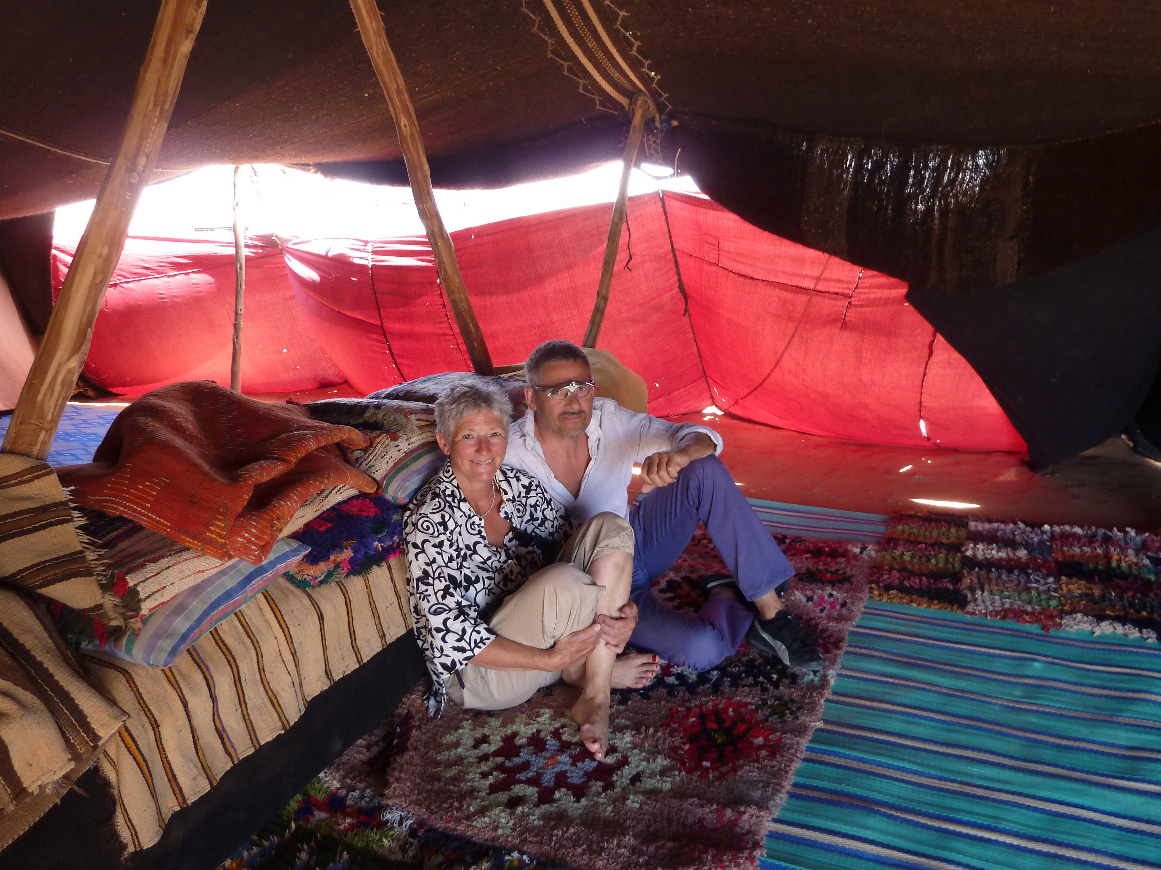 An einer Ausgrabungsstelle halten wir. Hier bauen sie «schwarzen Marmor» mit Versteinerungen von Schnecken und langen Muscheln ab. Daraus entstehen Lavabos, Tische und Schmuck, die sie so zurechtschneiden, dass die Versteinerungen besonders schön zur Geltung kommen. Überall im schwarzen Gestein sind wieder Versteinerungen zu entdecken. Am liebsten würde ich da den Tag verbringen und auf archäologischen Spuren wandeln. 350 Mio. Jahre sollen diese Schönheiten alt sein. Die Gegend verändert sich, die Steine wechseln sich mit Sand ab, Urs und Paul machen ihre Sache bestens – mein Ding wäre es nicht, über Stock und Stein zu fahren. An einer Nomadensiedlung halten wir erneut. Wir können einen Blick in die Küche werfen. Etwa einen Quadratmeter gross, mit Schilf eingemacht, ein kleines Oval als Ofen, die Glut ist noch heiss vom Brot backen. Daneben nochmals eine Feuerstelle für die Tajine – das wärs dann. Im Beduinenzelt, auf der Frauenseite, bekommen wir heissen, süssen Tee. Wir sitzen am Boden auf Berberteppichen, über uns das dicht gewobene, dunkelbraune, wasserdichte Tuch aus Kamel- und Schafhaar, hinter uns zum Anlehnen ein paar Kissen und Tücher. Die Wolle beisst durch meine Bluse hindurch. Die Frau sitzt uns gegenüber, in ein buntes Tuch gehüllt, mit rosarotem Lippenstift. Soweit sind sie also doch nicht weg von der Zivilisation.