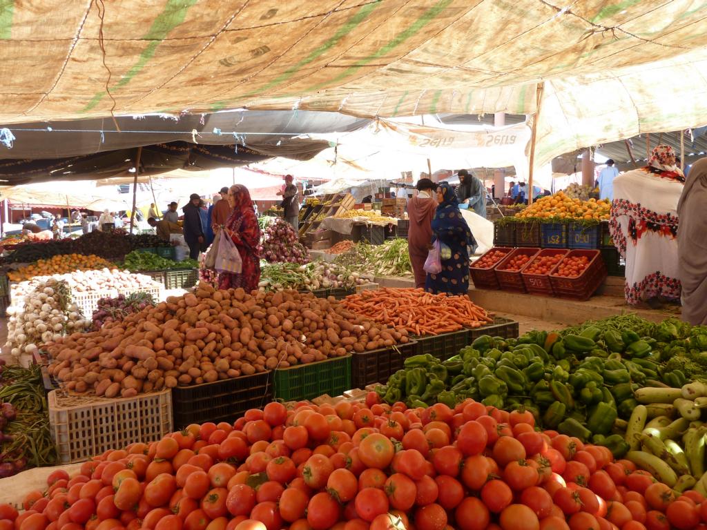 Wir sind früh unterwegs nach Guelmim. Heute ist Samstag und Markttag. Ein kleines Stück ausserhalb der Stadt, hinter langen Mauern mit einem grossen Eingangstor geht der wöchentliche Souk über die Bühne. Gemüse, Früchte, Haushaltsachen. Ein paar Stufen weiter unten findet der Tiermarkt statt: Schafe, Ziegen, Rinder, Esel und Dromedare.