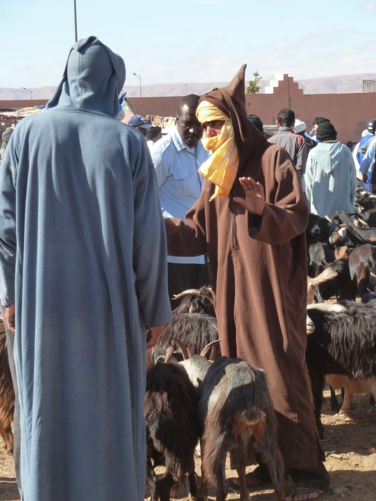 Die Männer in wallenden Djeballas und Turban drücken und begutachten die Geissen, palavern miteinander und scheinen einen guten Tag zu haben.