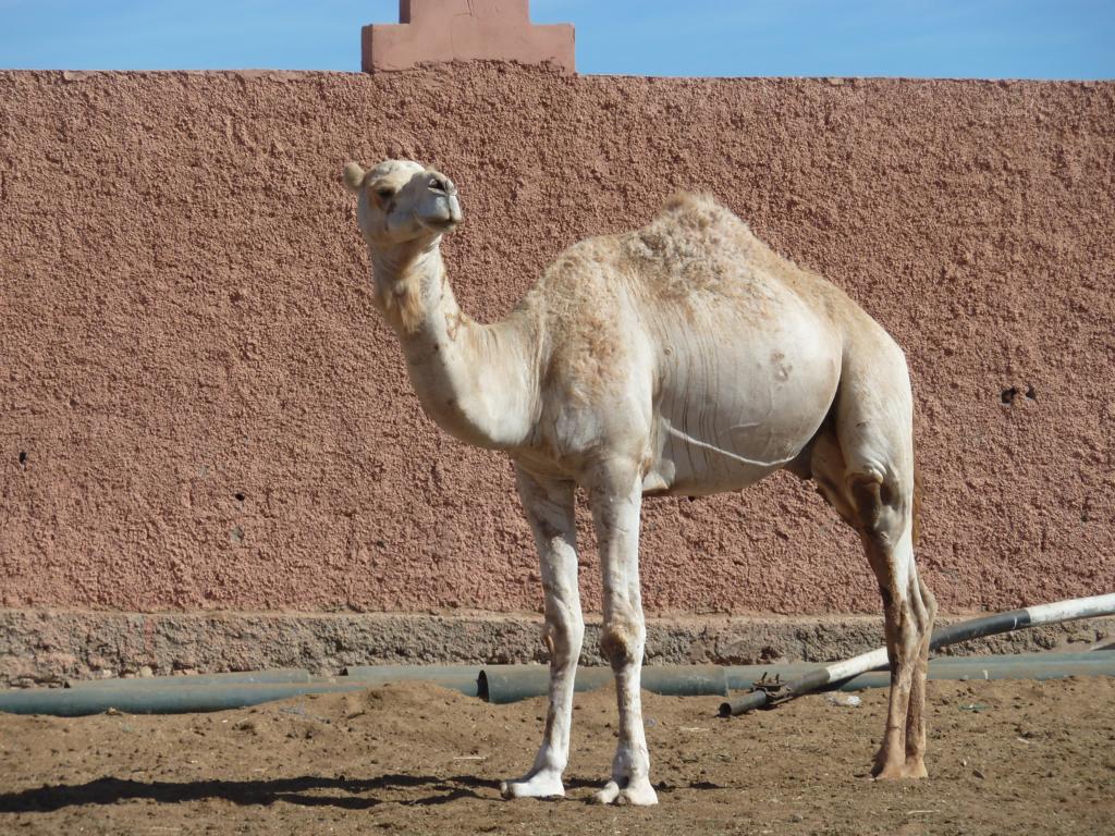 Friedlich stehen die Dromedare in Gruppen zusammen, fressen Heu und schauen neugierig in die Runde. Natürlich haben wir schnell Begleitung von einem Berber und wir werden über die Dromedarrassen aufgeklärt: die Dunkelbraunen, etwas Kleineren kommen aus Mauretanien, sind gut für die Arbeit, die Braunen aus Marokko fürs Lastentragen der Karawanen, für die Zucht und fürs Fleisch und die weissen, stolzen Mehari kommen aus Mali und sind die kostbaren Leittiere der Karawanen. Sie können Wasser aus 20 Kilometer Entfernung riechen.