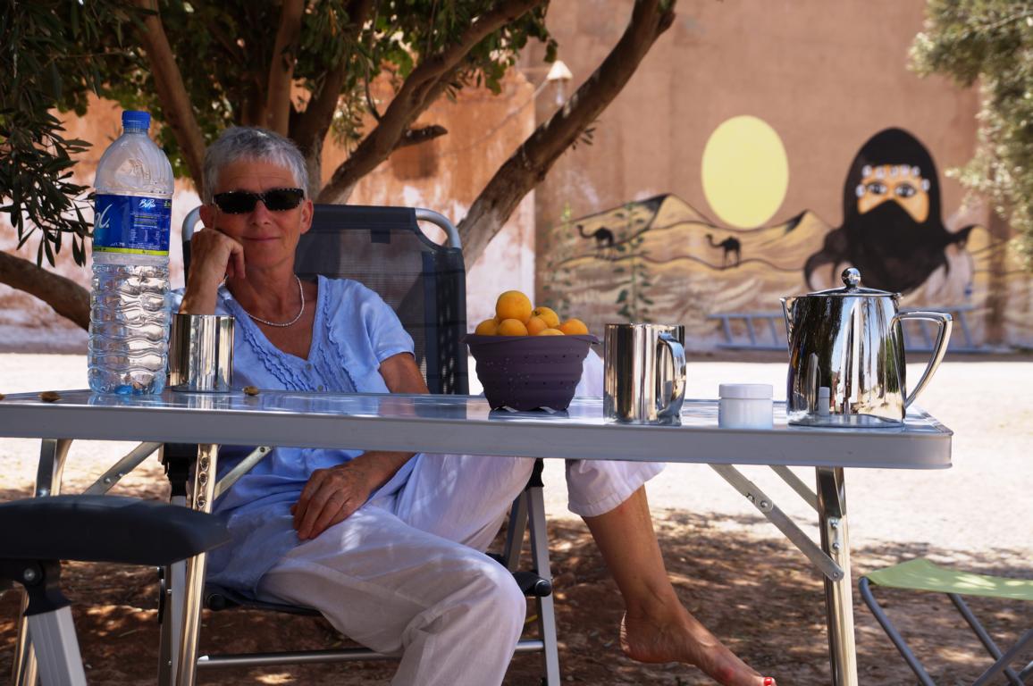 Wie oft haben wir wohl thé à la menthe getrunken? Es ist immer wieder herrlich, die Teezeremonie zu beobachten. Wie ein Wasserfall wird von weit oben eingeschenkt, bis sich im kleinen Glas Schaum bildet, die Farbe begutachtet, in den silbernen Krug zurück geleert, ein neues Glas gefüllt, wieder zurück, ein Schluck probiert, noch ein bisschen Abwarten und dann endlich – der feine, süsse, aromatische Tee. Einer erklärt, dass immer drei Gläser getrunken werden: das erste – so frisch wie die Jugend, das zweite – so süss wie die Liebe, das dritte – für den Durst und den Tod. Und das sicher fünf bis sechs Mal am Tag.