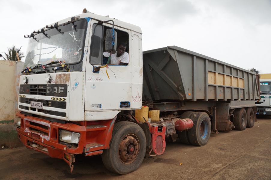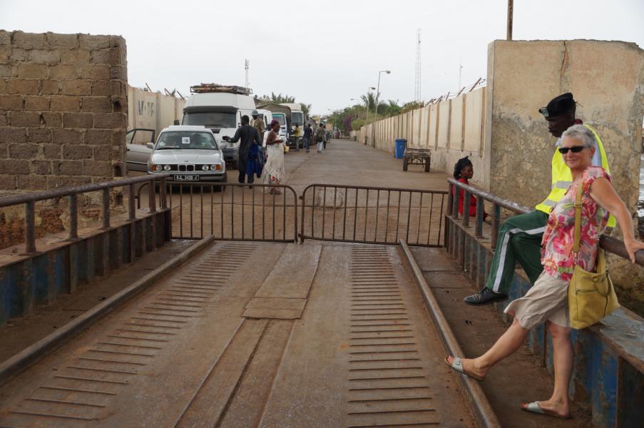 Es geht los Richtung Gambia. Bei mir bleibt ein etwas mulmiges Gefühl wegen der Grenze. Wir werden bei der Ausreise zwar umzingelt, doch es gelingt in kurzer Zeit, die drei Büros zu passieren. Lange anstehen muss ich auch nicht. Das Carnet de passage wird auch rechtmässig abgestempelt (obwohl wir das Papier «passavant» ohne zu verlängern vernichtet haben) – alles hat wieder seine Ordnung. Beim Polizisten im Büro hängt einer oben nackt an den Gitterstäben, gleich neben seinem Pult werden sie eingebuchtet. Die Grenze zu Gambia ist anschliessend, ein Riesenumlad und viele Leute sind in den klapprigsten Kisten unterwegs. Die vier Büros schaffe ich relativ schnell und sogar ohne zu zahlen. Auch hier steht im Durchgang ein Käfig, in dem einer auf dem blanken Boden liegt, wenigstens hat er noch Wasser. Doch zu früh gefreut, jetzt kommt der Fahnder und untersucht unser Auto eine ganze Stunde lang. Beim Teebaumöl will er wissen, was da drin ist, warum Gift drauf steht, meinen spagyrischen Spray gegen Reisekrankheit muss ich ihm im Detail erklären. Doch Urs wickelt das mit ihm zusammen in aller Ruhe im Häuschen drinnen ab, obwohl mir schon draussen der Schweiss in Strömen herunterläuft. Er sucht Drogen und Waffen. Ok – nichts gefunden wir können weiterfahren. Einer gibt mir noch den Tipp, dass jetzt alles in Ordnung ist, wir frei in Gambia herumfahren können und ich ihn anrufen soll, wenn es Probleme gibt. Kurz darauf die erste Polizeikontrolle. Der Polizist sieht das rote Etui mit dem Feuerwehrsackmesser von Urs. Er muss es ihm erklären und dann will er das Messer gleich als Geschenk haben. Ich zücke mein Handy und erkläre, dass ich gleich den Zoll anrufe, da wird er gerade ein bisschen netter und lässt uns passieren.