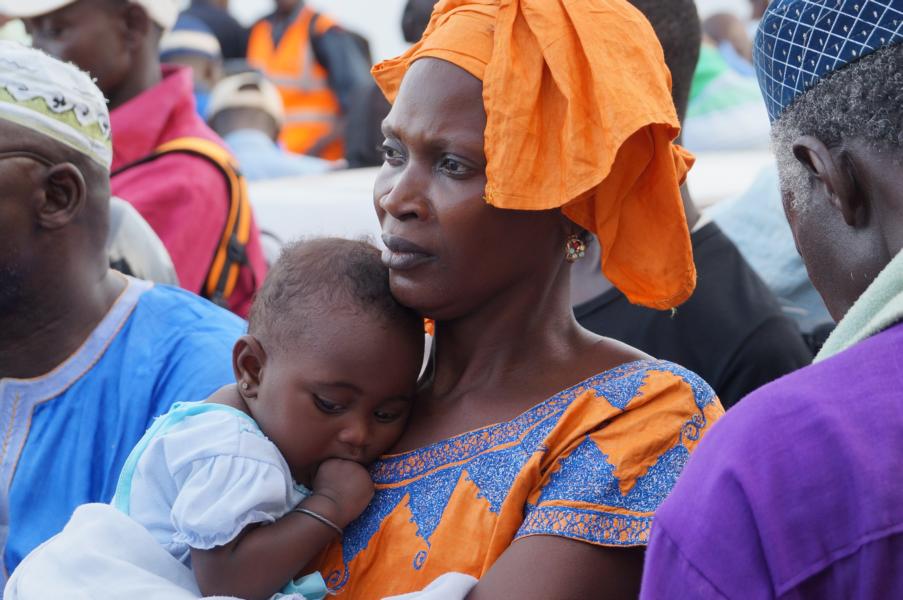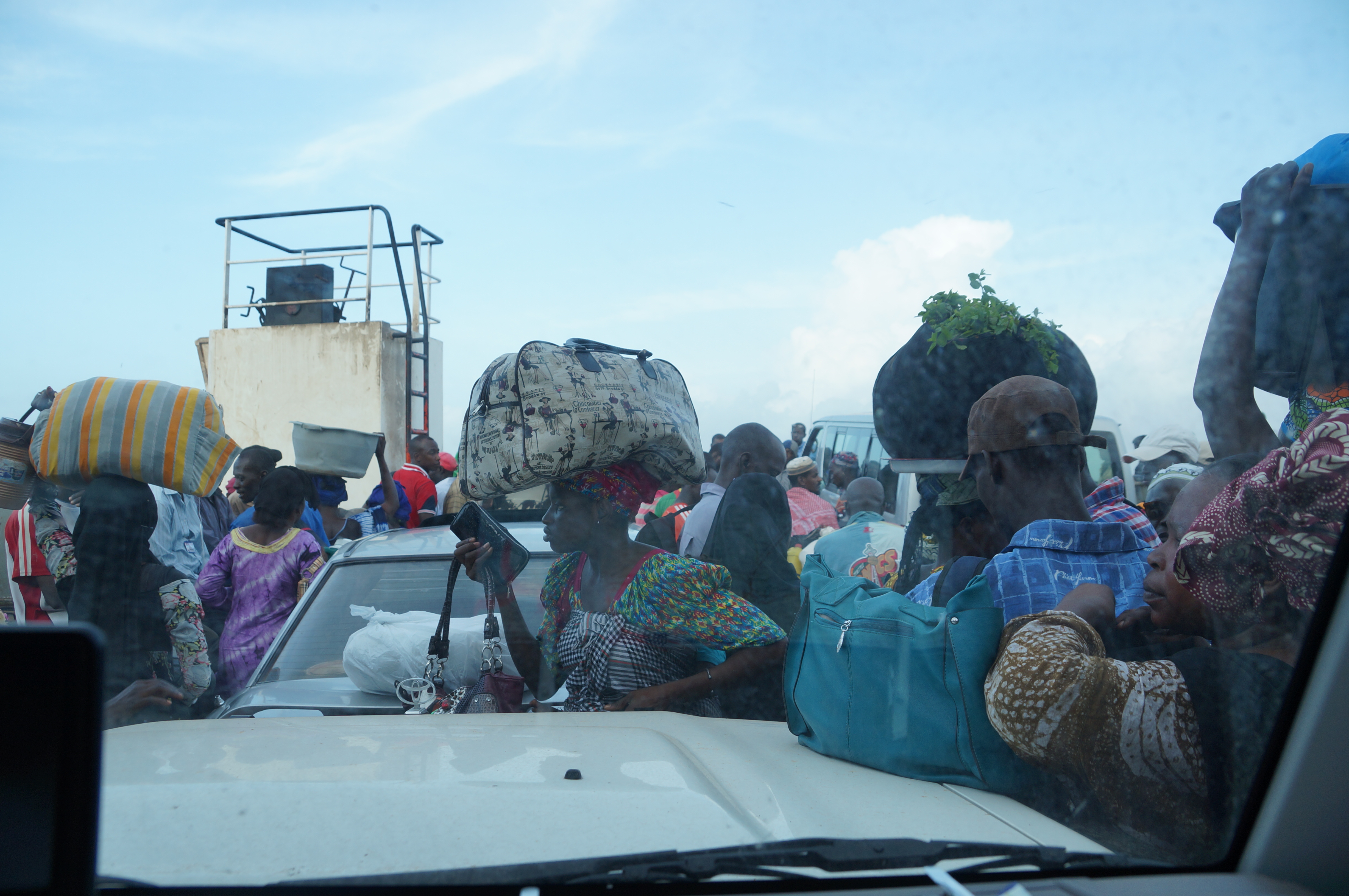 Mit einer Flasche Wasser machen wir zwischen Wand und Auto eine Kurzdusche, waschen uns den Schweiss von sieben Stunden Warterei ab. Irgendetwas stimmt mit unserer Wasserpumpe nicht, so können wir leider die Aussendusche nicht benützen. Im Morgengrauen singt der Muezzin den melodiösen Gesang des Gebetes, wie ein Schlaflied. In Senegal und Gambia tönt der Ruf aus dem Minarett weicher und lieblicher. Neben den Autos und LKW geht die Morgentoilette los, die meisten pissen an die Wand. Die auf sieben Uhr angekündigte Fähre kommt fast pünktlich um 7.30 Uhr. Einige die an uns vorbeilaufen, kennen uns noch von gestern. Was macht ihr denn noch hier? Ja das möchten wir auch wissen.