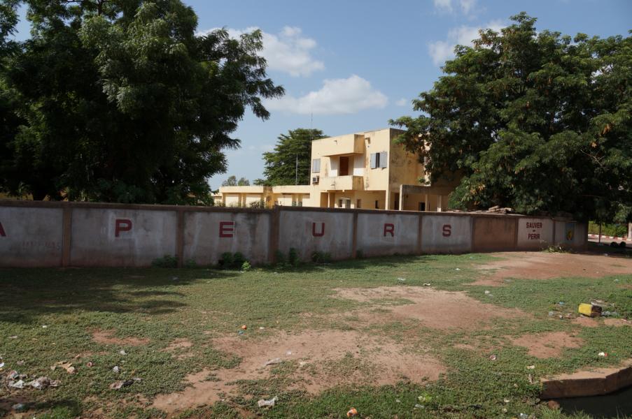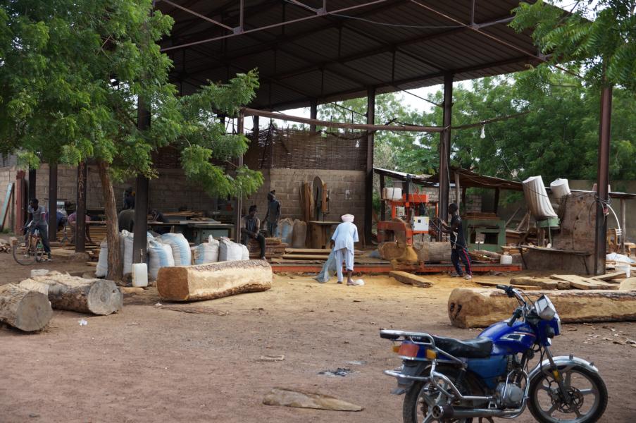 Sägerei mit zahlreichen Arbeitern, für das Foto haben sich viele versteckt.