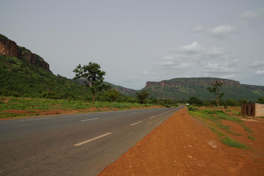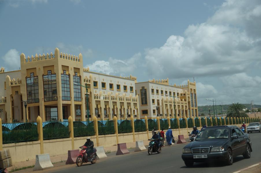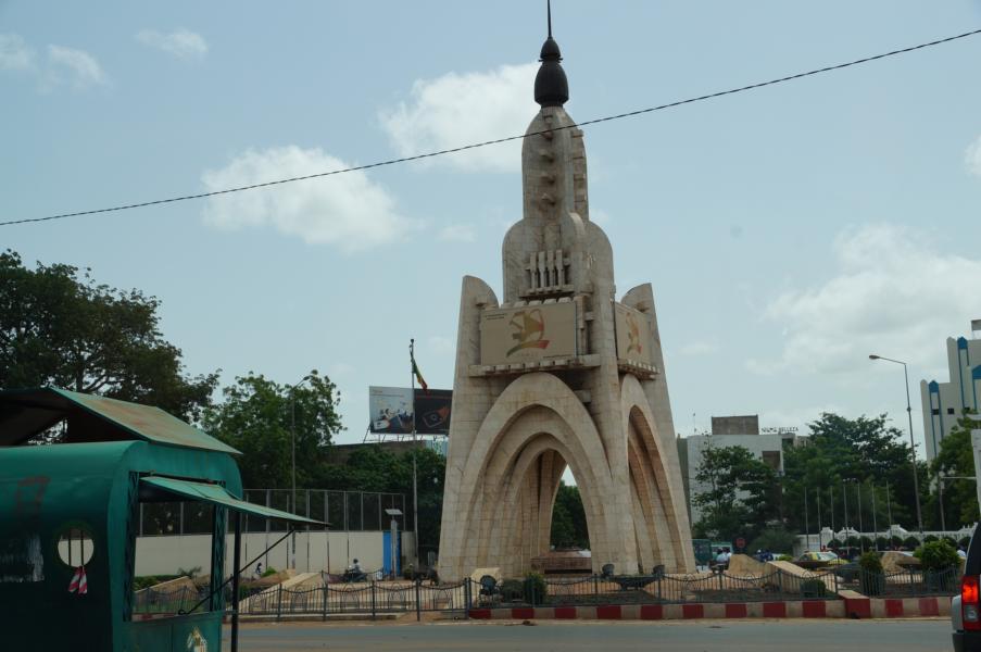 Mädchen und junge Frauen waschen in Gelten oder am Fluss Wäsche, die nachher auf der Wiese trocknet. Vor der Stadt verwandeln sich die malerischen Rundgebäude in viereckige, gemauerte, meist unverputzte kleine Häuser. Von einer hügeligen Strasse aus dem üppigen Grün führt der direkte Weg in die brodelnde Hauptstadt Bamako. Es herrscht ein Riesenverkehr von Taxis und Rollern, doch alle fahren wohl zügig, doch rücksichtsvoll, Blech an Blech. Nach einem Abstecher in einem nicht empfehlenswerten Hotel holen wir am nächsten Tag Paul aus der Garage – es ist ein kleiner Service notwendig – und unsere Pässe in der Botschaft von Burkina Faso ab. Riesige Kreisel mit monumentalen Denkmälern, zwei grosse Brücken über den Niger und eine immense in gelb-beige gehaltene Stadtverwaltung mit allen Ministerien prägen das Bild von Bamako.