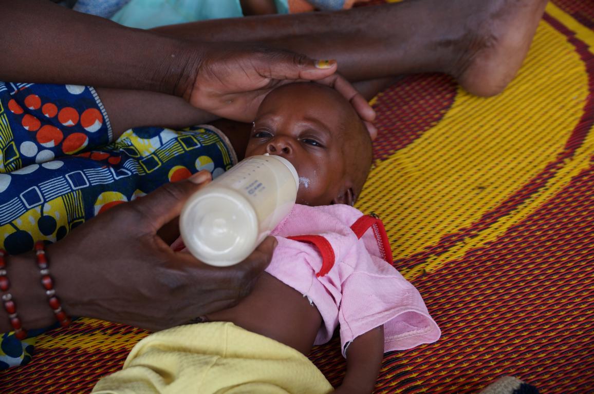 Manchmal kommt der Papa vorbei und schaut nach ihnen oder gibt etwas Mais ab für die vier Mamans. Wenn die Kinder grösser sind, kehren sie oft wieder in ihre Familie zurück oder im Dorf stellt sich eine Grossfamilie zur Verfügung, die Kinder aufzunehmen.So sind sie wenigstens gut untergebracht, die medizinische Versorgung ist sichergestellt und dank der Nestlé Babynahrung aus der Schweiz müssen sie keinen Hunger leiden. Sofort bekommen wir Stühle, etwas zu essen und zu trinken.Die Frauen sitzen auf einer Matte am Boden und falten einen Berg Kinderwäsche zusammen. Windeln gibt es keine und so müssen sie umso mehr Kleider waschen.