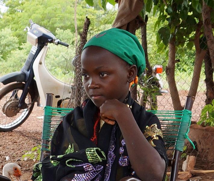 Überall auf der Strecke finden lange Begrüssungsrituale in Bambara statt, immer wieder tönt es lannie tsche mit den vielen Antworten dazwischen. Es wird nach dem Wohlergehen der ganzen Familie gefragt, Eltern, Kindern, wie es einem geht, bevor sie weiterziehen mit den besten Wünschen für Glück und Gesundheit. Gloria weiss auch, wo kürzlich eine Frau ein Kind bekommen hat. Wir schauen auch dort vorbei und finden die dreiwöchige Marie, in der Wollkappe, umringt von ihrer Familie. Eine Gruppe Mädchen, 10 bis 12 Jahre alt, kommt mit den archaischen Hacken vom Feld. Sie sind müde. Gloria erzählt, dass die Frauen hier sehr hart arbeiten müssen, auf dem Feld, im Haushalt, das Stampfen des Korns, kochen für die ganze Familie und dann die vielen Kinder, die sie bekommen. Zu einseitig sind sie ernährt von Mais und Maniok, es fehlen die Vitamine.