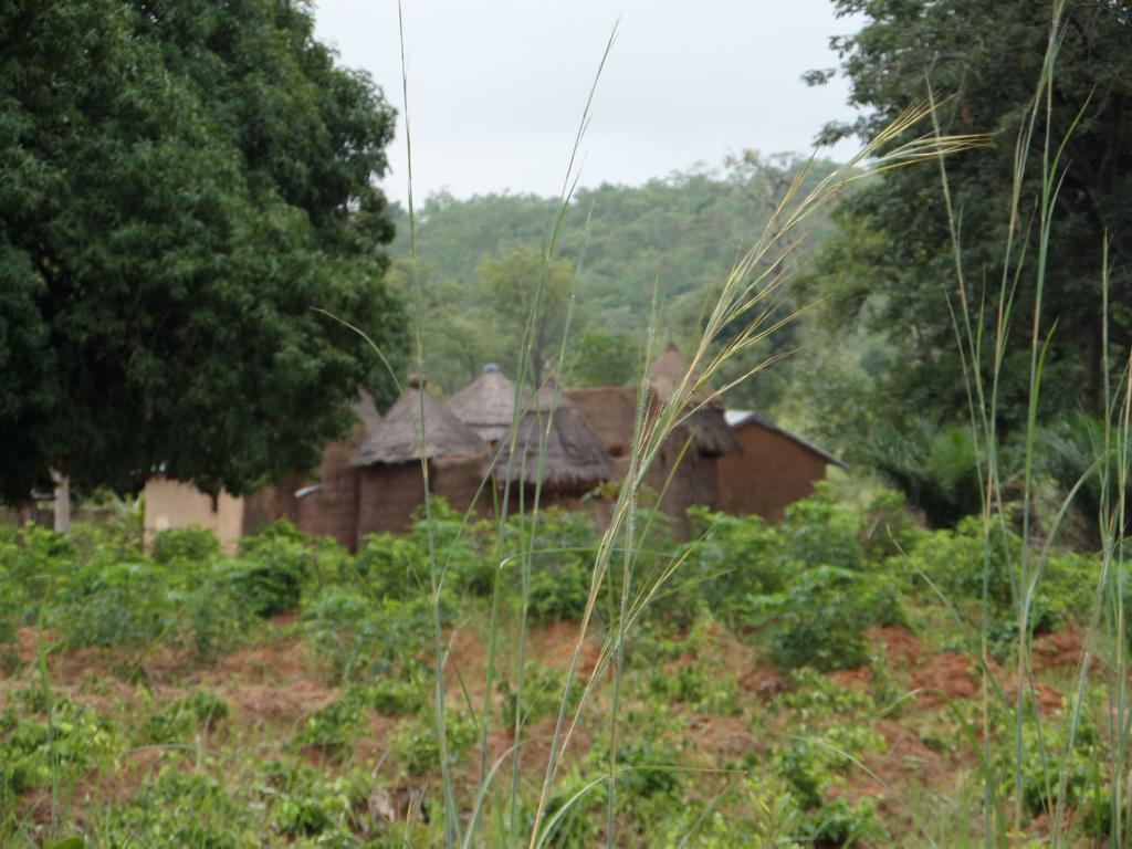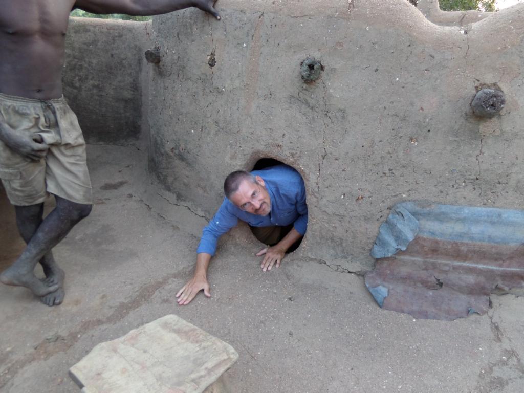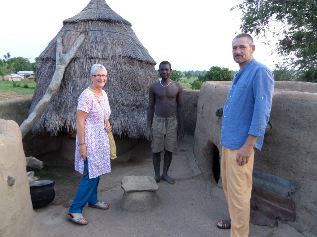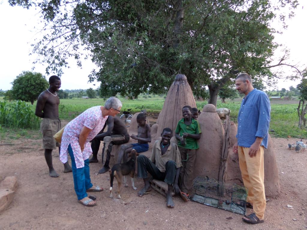 Zwischendurch spritzt oranges Wasser aus den Pfützen, die Fenster sind offen und die Schleier der Nonnen wehen im Wind. Urs und ich kommen uns vor wie in einem Komikfilm. Wir alle müssen uns den Bauch vor Lachen halten, wenn uns eine Bodenwelle wieder durchrüttelt. Da steht rechts am Wegrand ein grosser Baobab – das ist die Grenze zu Togo und wir fahren einfach durch, ohne Visum und ohne Polizei! Am Donnerstag wenn Markt ist, steht ein Polizist da und fragt die passierenden Leute, was sie ihm Schönes mitbringen. Nach einigen Kilometern Holperweg treffen wir bei den Franziskanerbrüdern in Togo ein. Sie räumen gerade einen Bougainvillea auf, der altershalber zusammengekracht ist. Eine lustige Begrüssung mit viermal die Schläfen gegenseitig aneinander drücken. Unsere mitgebrachten Sachen werden abgeladen und wir fahren nach der Besichtigung der Kirche gleich weiter in ein Tata-Dorf.