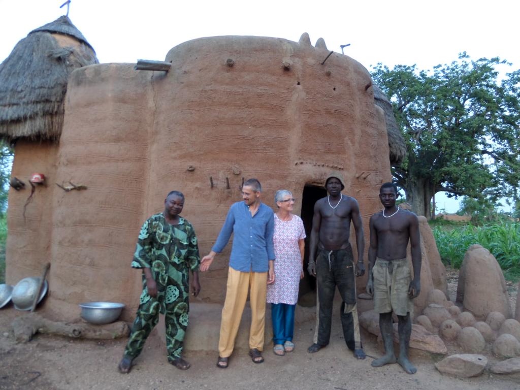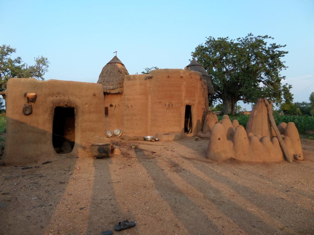 In dieser Gegend wohnt das Volk der Tata grenzüberschreitend. Erst wird der Vater vom Feld gerufen, denn er muss die Einwilligung für die Besichtigung geben. Vor dem Haus stehen die Fetische der Ahnen als konische Elemente. Schwarze Blutspuren und einige Hühnerfedern kleben am grossen Element, das den Grossvater symbolisiert. Immer wenn eine Entscheidung getroffen werden muss, rufen sie die Ahnen an und opfern dafür ein Tier. Die Grossmutter und die Kinder sind als kleinere Elemente dargestellt. Neben dem Haus sind die Elemente der Gesundheit, die bei Krankheiten oder Leiden befragt werden können. Eine schmale Öffnung führt in die «Kornwerkstatt». Links wird mit einem grossen Mörser das Korn zerkleinert, rechts auf einem rauhen Stein zu Mehl geschabt. Wieder eine kleine Öffnung, hier ist der Geissen- und Schafstall, sie schlafen artengetrennt im Wohnhaus der Tata. Dann folgt die Küche mit der Marmite auf der Holzkohle. Das alles umfasst etwa acht Meter Durchmesser. Als Leiter dient eine dicke Astgabel mit eingeschnitzten Tritten, auf der man einen Stock höher und bereits ins Freie gelangt. Eine weitere Leiter führt auf das Dach mit den Schlafplätzen für die Eltern und die Kinder sowie die runden Vorratskammern.