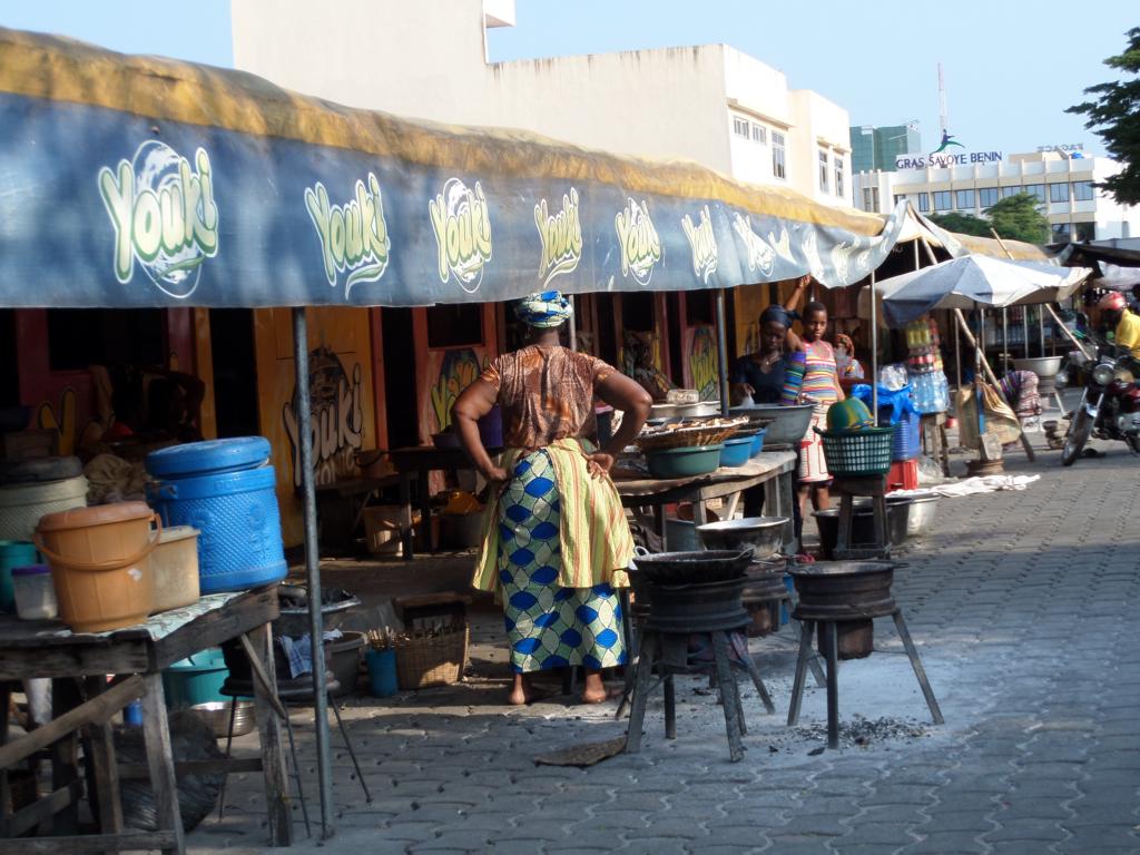 In einer langen Gasse kochen die Mamas in grossen Marmites auf der Holzkohle für die Arbeiter vom Bau, Büro und Business. Teig brutzelt im Öl, getrocknete Fische liegen auf dem Baumbusgeflecht, Reis im Topf und natürlich scharfe rote Sauce mit Zwiebeln gehören auch dazu.