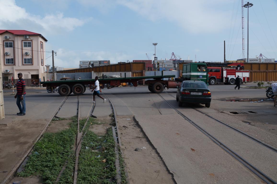 Wahrscheinlich ist das Gleis in den Hafen nicht mehr in Betrieb. Im Hafen selbst herrscht emsiges Treiben mit der Ent- und Beladung der Container. Leider Zugang verboten.