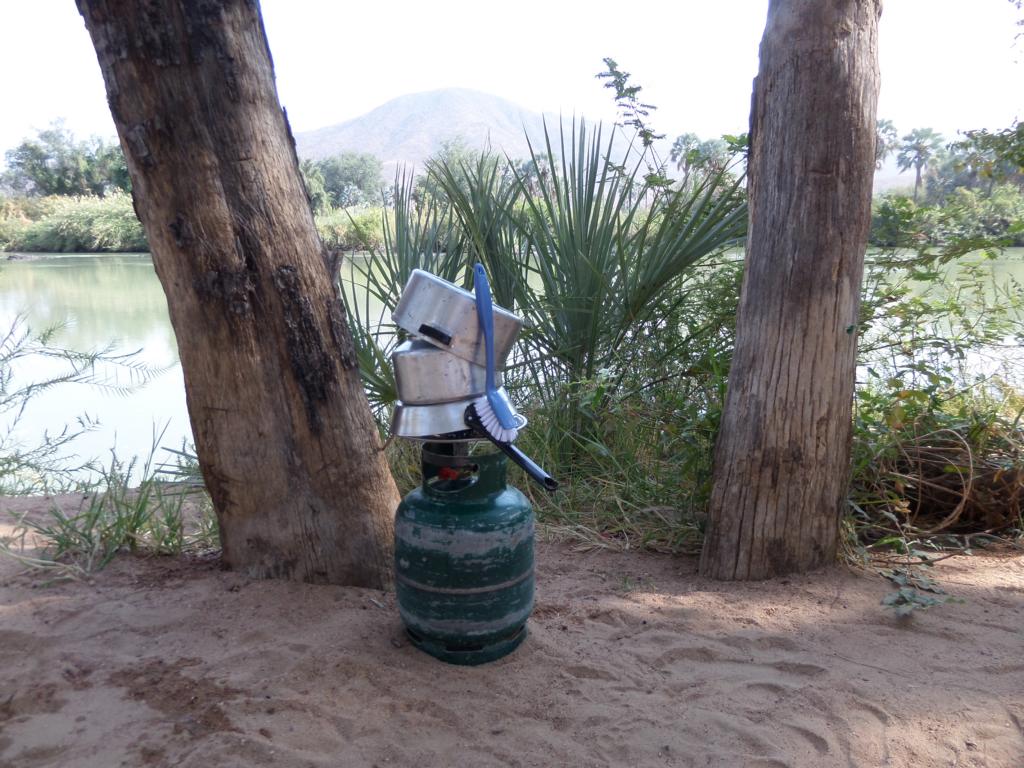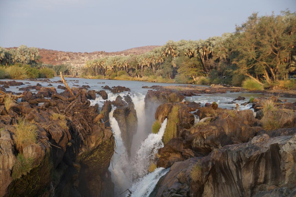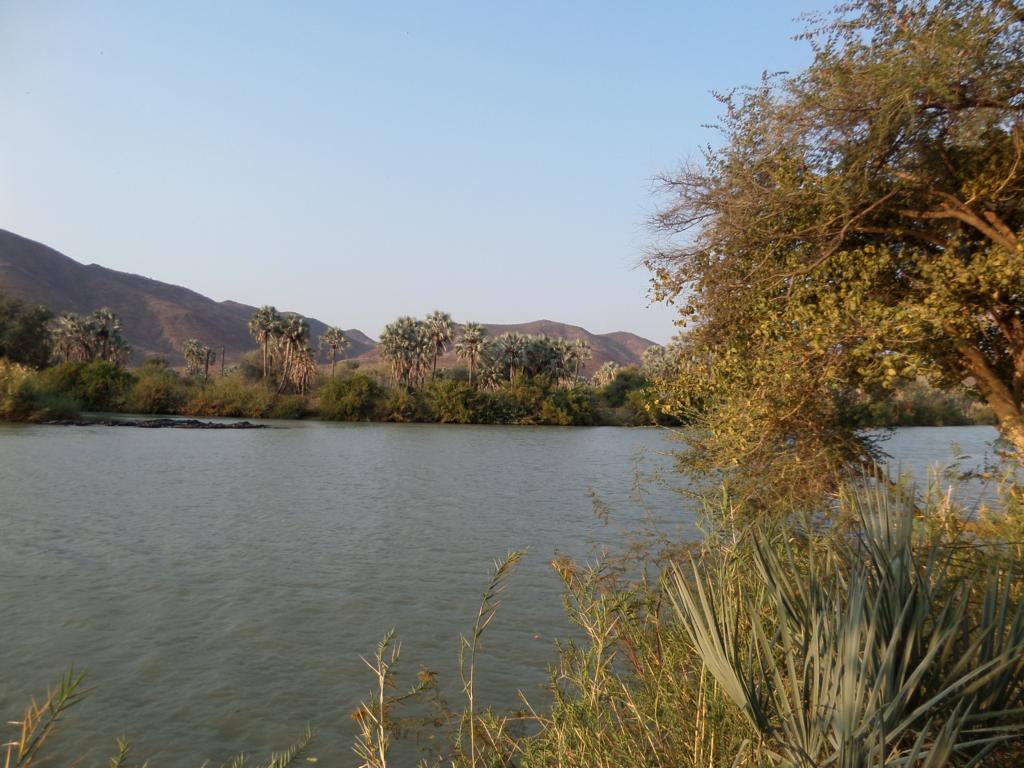 Die Bäume sind alle noch gleich – die Openairdusche ist einem Duschhaus gewichen und ein Pool ist dazugekommen. Wir geniessen es, am Kunene zu sitzen und dem nahen, 40 Meter in die Tiefe brausenden Wasserfall zu lauschen. In der Nacht rauschen die Makalani-Palmen und der Wasserfall um die Wette.
