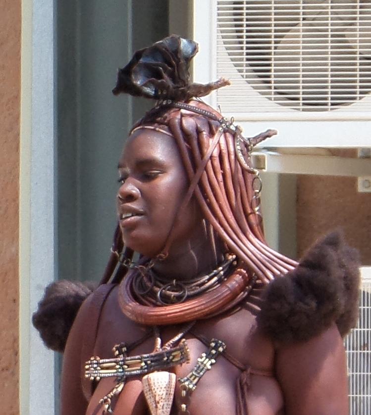 Eine Art Lendenschurz vorne, hinten ein zottliges in Falten gelegtes Fell. An den Füssen Ledersandalen mit Lederriemchen, dazwischen glitzern metallene Reifen. Sehr oft sind es bildschöne Frauen, doch was tun sie hier in der Zivilisation? Sie hocken vor dem Supermarkt, verkaufen ihre selbstgebastelten Armbänder aus Perlen und trinken Bier. Kein schöner Anblick. Die Himbas sind ein sehr traditionelles Hirtenvolk, das als Halbnomaden mit ihren Ziegen und Kühen je nach Wasserlage weiterziehen. Sie leben in Clans in Hütten aus Palmästen und -blättern, die mit Dung und Lehm verputzt werden. Der wichtigste Ort im Kraal ist das heilige Feuer, das nie erlöschen darf, da es die Verbindung zu den Ahnen ist.