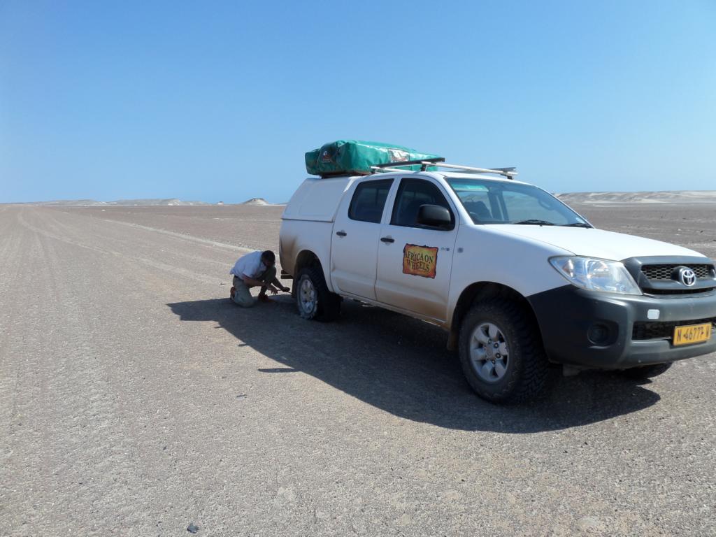 Er tönt wie ein überdimensionierter Bunsenbrenner. Keineswegs ruhig, da auch noch unser Zelt recht hin- und her geschüttelt wird. Dann am Morgen die Überraschung Nummer 3: der neue Pneu verliert Luft. Wir verlängern eine Nacht und fahren die 180 km und zweieinhalb Stunden in die Garage nach Opuwo. Das montierte Ventil ist defekt. Doch am Abend sind wir wieder zurück, um Luft und eine Erfahrung reicher.