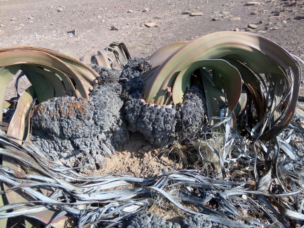 Kurze Zeit später reisen wir weiter. Wir haben Glück, denn das Gate zum Nationalpark schliesst um 15.00 Uhr, bis um 19.00 Uhr müssen wir beim nächsten Tor und draussen sein. Über Nacht darf man nicht im Nationalpark bleiben. Endlose Weite mit roten Bergmassiven tun sich auf, ab und zu sehen wir ein paar Springböcke. Es ist immer schön, die Tiere zu beobachten, wenn sie noch ungestört sind. Wir bewundern am Wegrand die Pflanze Welwitschia mirabilis, die von den Namibiern «Methusalem» genannt wird. Die Pflanze wächst nur in Namibia und Angola und wird bis zu 2000 Jahre alt. Es sind noch 5000 bis 6000 Exemplare davon vorhanden. Wenn die Pflanze nicht blüht, besteht sie nur aus zwei grünen Blättern. Sie werden vom Wind zerzaust, vom Wild angeknabbert und reissen ein, bis sie aussieht wie ein herumliegender Blätterhaufen. Ein sonderbare Spezie.
