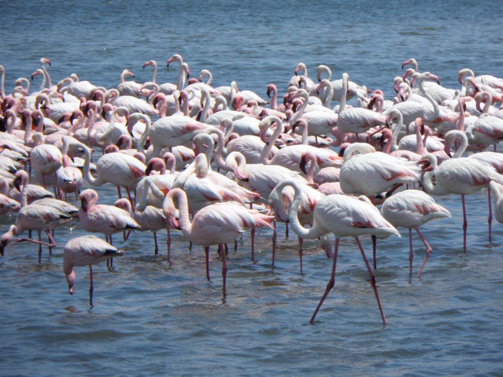 Wir fahren ca. 30 Kilometer südlich bis nach Walvis Bay, erkunden den Hafen, wo wir dann endlich nächste Woche unseren Paul in Empfang nehmen werden. In der südlich gelegenen Lagune tummeln sich Tausende von Rosaflamingos auf ihren stacksigen Beinen. Sie suchen im seichten Wasser und den Salzpfannen nach Krebsen und Plankton.