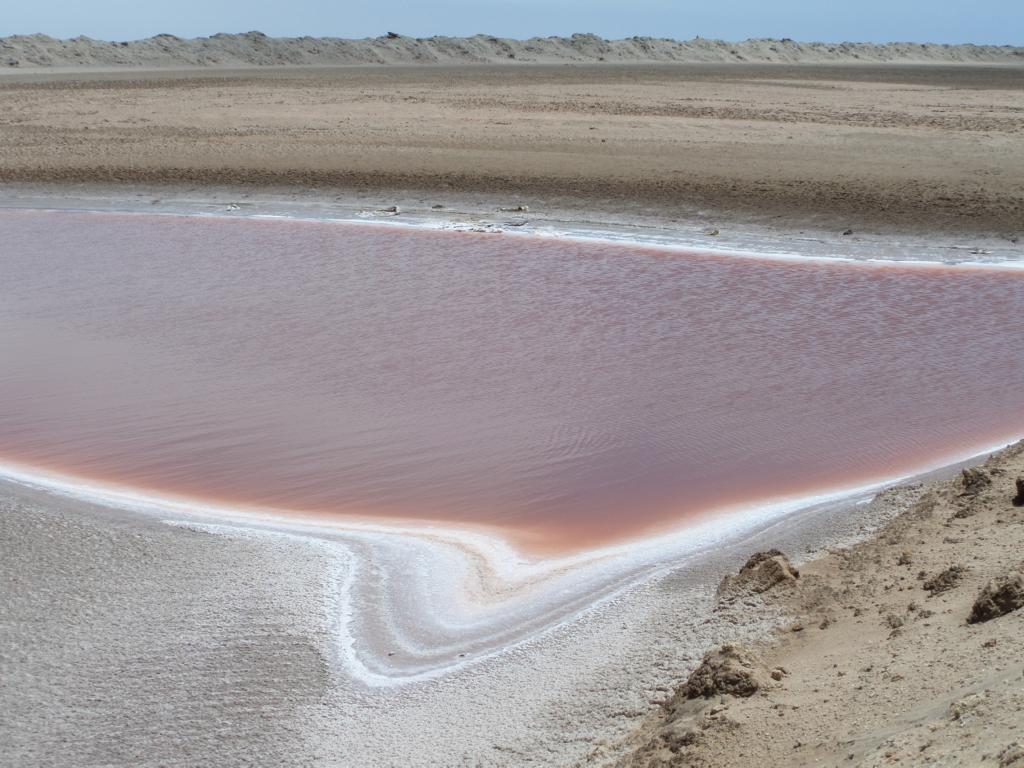 Im Flug werden die scharlachroten Flecken an den Flügeln sichtbar – wie schwebende Farbtupfer in der Kulisse des blauen Himmels. Wie die vielen grauen Wasservögel heissen haben wir trotz neu erstandenem Vogelbuch nicht herausgefunden. Ein riesiges Gebiet ist in Salzpfannen angelegt, die Lastwagen kurven auf den getrockneten Flächen herum, laden tonnenweise Salzmasse auf. In der nahe gelegenen Salzfabrik wird das gräuliche Etwas in schneeweisse Masse veredelt, sie türmt sich zu spitzigen Bergen auf.