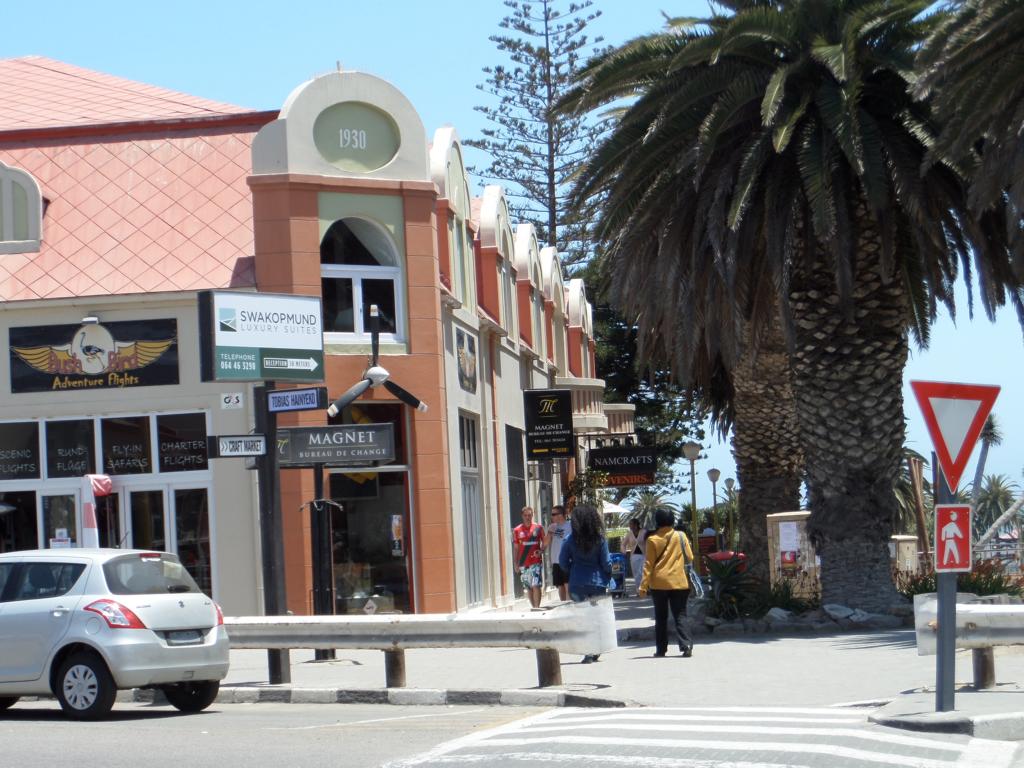 Ein Stück Deutschland – am Rand der Wüste – so wird das kleine Küstenstädtchen häufig beschrieben. In Swakopmund ist sehr viel von der deutschen Atmosphäre erhalten geblieben: einige Häuser im Kolonialstil sind perfekt renoviert worden, Jahreszahlen an den Häusern weisen bis Anfang des letzten Jahrhunderts zurück. Viele Fachwerkbauten, farbige Häuserzeilen erinnern an ein Seebad irgendwo an der Ostsee. In den Sommerferien, das heisst an Weihnachten, soll Swakopmund von den Namibiern richtig überrannt werden, sie schätzen das frische Klima, die Meeresbrise und die Urlaubsgefühle. Viele Besucher finden die Mischung aus Filmkulisse und Legoland liebenswürdig. Die Bilder muten wirklich sonderbar an: vom Landesinnern her kommend die mondlandschaftähnlichen Sandhügel, einzig Palmen sind überlebensfähig, dann gegen Süden die hohen, orange-roten Sanddünen und im Westen der kalte, stürmische Atlantik. Im Ort selber ein gemächliches Dahinschlendern, viele Geschäfte für Touristen mit Kunst und Kitsch, das berühmte Café Anton (das allerdings auch wieder einmal ein face lifting nötig hätte) mit Schwarzwäldertorte und Apfelstrudel.
