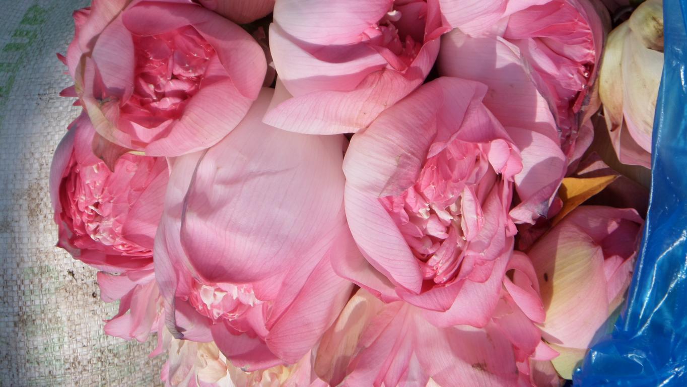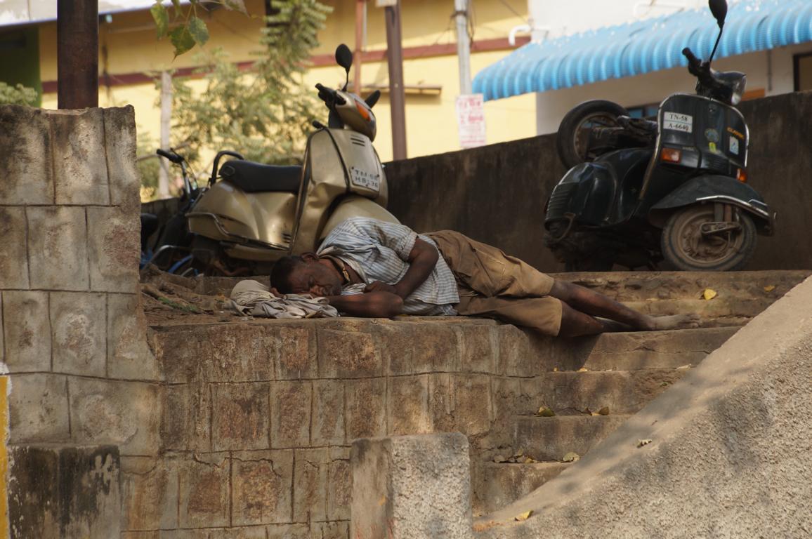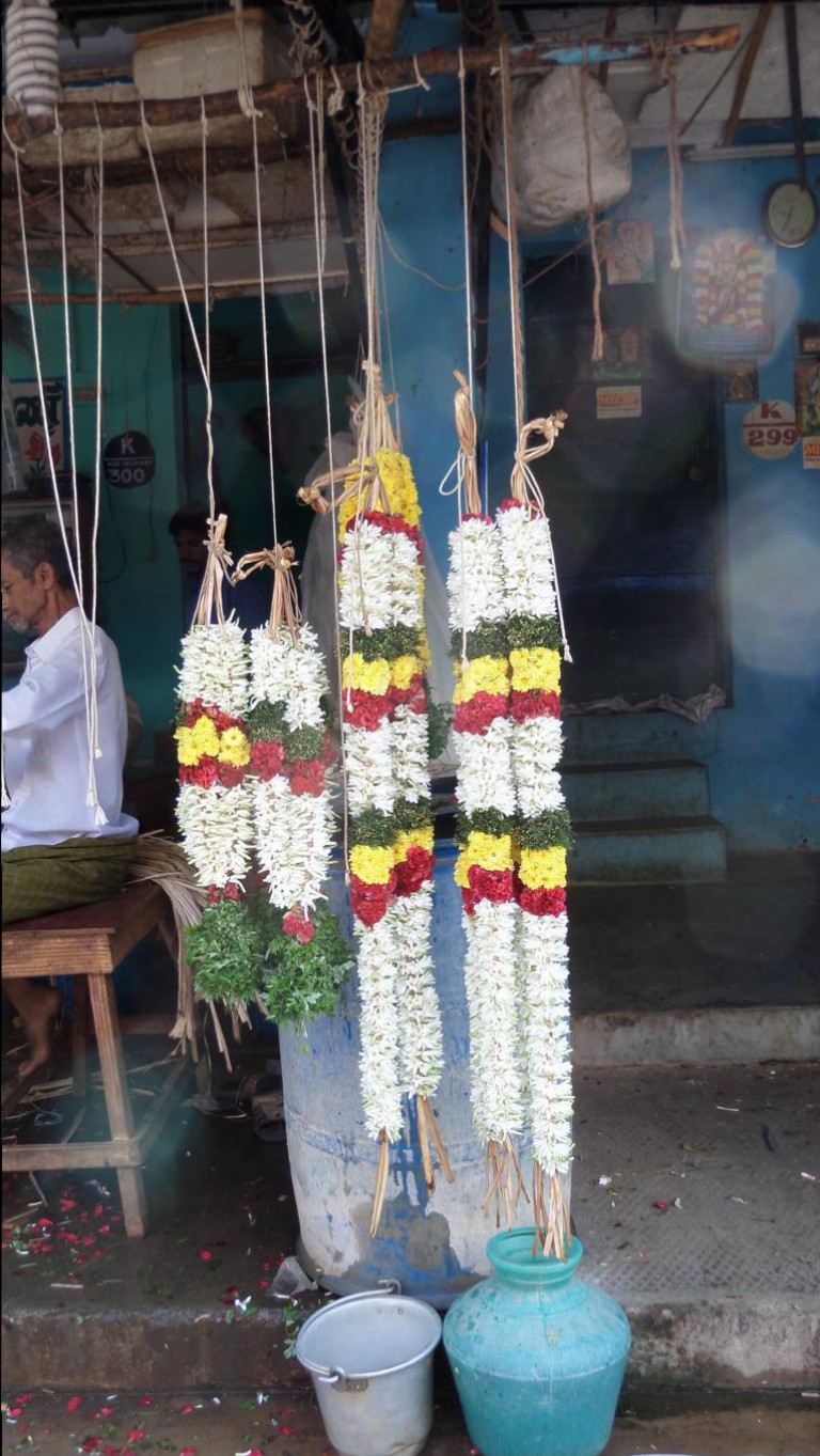 ein paar Menschen schlafen auf der Zeitung, Kühe liegen vor der Tür, auf einem Karren wird mit einem Kohlenbügeleisen die Wäsche gebügelt, die Frauen verkaufen Knoblauch, Bohnen und die farbenprächtigen Blumengirlanden für den Götterschmuck.