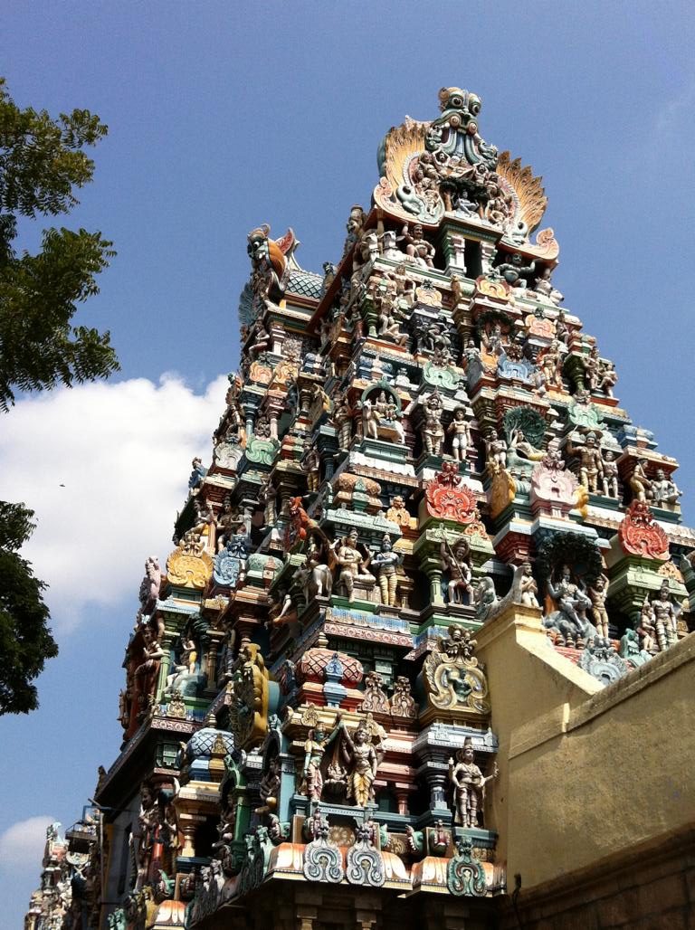 Die Eingänge stehen für den Menschen mit Kopf, zwei Beinen, zwei Armen. Sie sind mit farbenfrohen Figuren, Göttern und Gestalten geschmückt. Jede Marmorsäule in den langen Gängen im Innern des Tempels ist mit unterschiedlichen Sujets versehen. Die Anfänge des Tempels reichen ins 12. Jahrundert zurück, wie sie das wohl gemacht haben? Die tägliche Besucherzahl beträgt rund 50 000 Menschen. Er umfasst eine Fläche von 62 000 Quadratmeter und ist Gott Shiva und seiner Gattin Parvati gewidmet. Ja die Hindu-Götter sind eine Sache für sich. Es soll ca. 330 000 davon geben. Wir sind froh, wenn wir Ganesh mit dem Elefantenrüssel erkennen. Vor dem Tempel wollen alle Geschäfte machen. Wahrsager lesen aus den Karten und an jeder Ecke gibt es goldglänzende Hindu-Heiligkeiten zu kaufen.