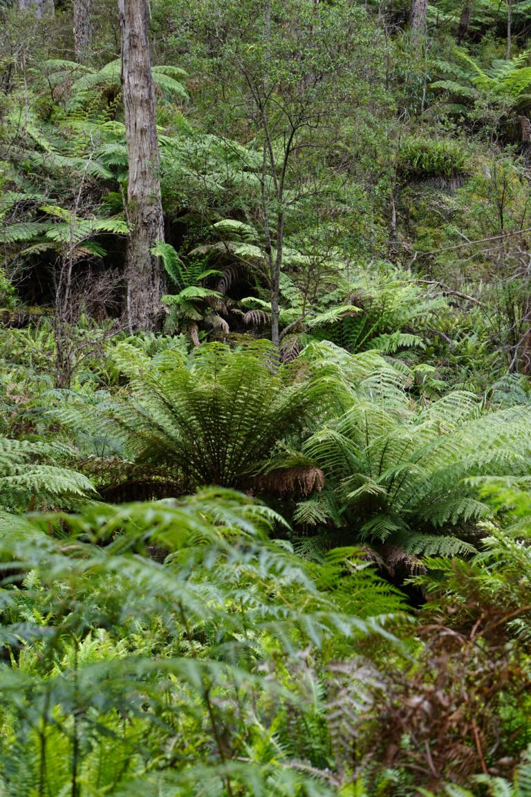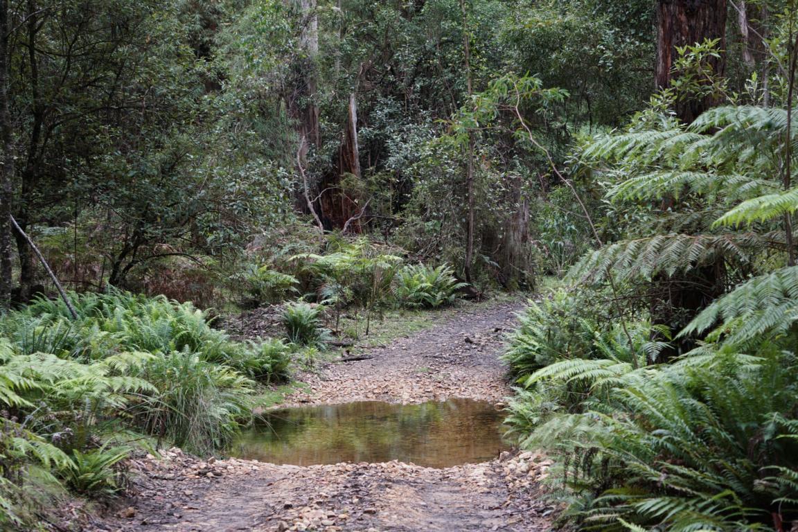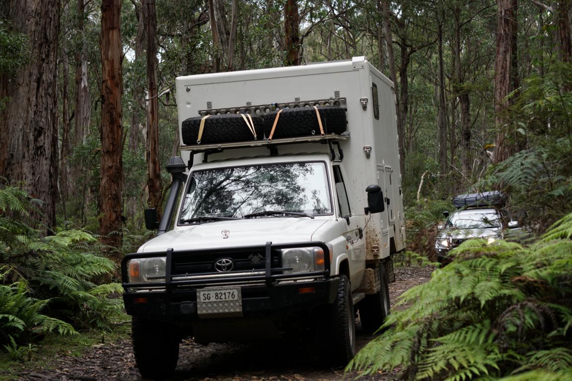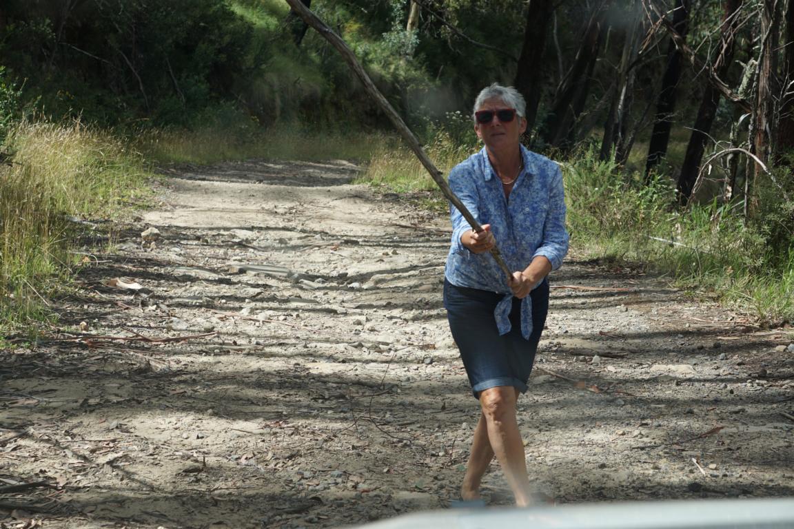 Dann geht’s weiter in den Alpine National Park, bis auf 1700 Meter. Zu Beginn der Strecke wird vor Schnee und Eis gewarnt, – kaum zu glauben, zuoberst fieselt es wirklich wie Schnee. Unser Reisetag ist lange. Auf dem Cornhill Logging Track kommen wir oft nur mit 4 km/h vorwärts, Paul und Urs müssen sich gleichermassen rauf und runter arbeiten. Ich räume manchmal einen Ast aus dem Weg und sonst muss ich mich einfach nur festhalten.