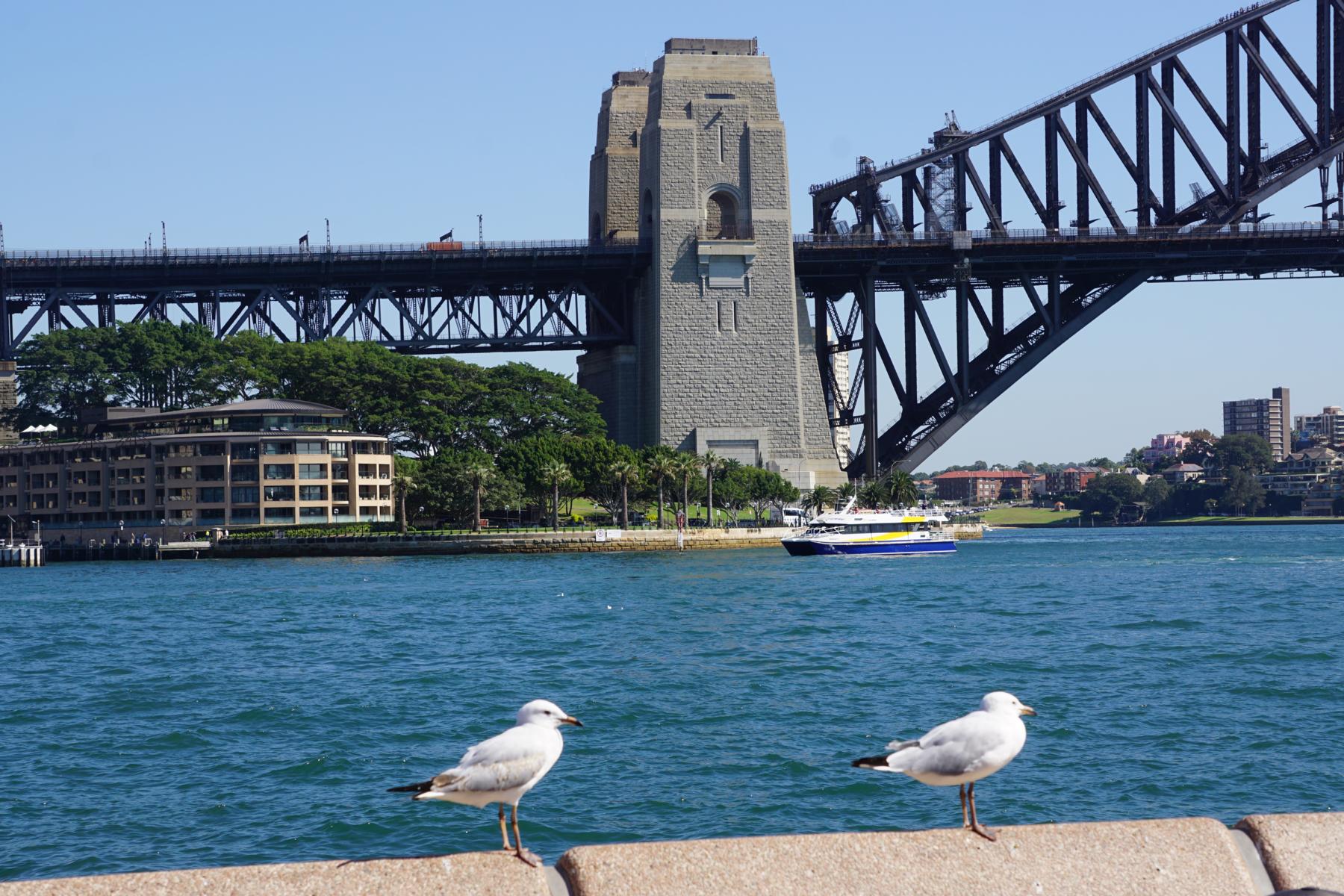 Die Harbour Bridge – auch Kleiderbügel genannt – eines der Wahrzeichen von Sydney. Wir können es nicht glauben, dass wir vor Jahren die Brücke erklommen haben. Im Hafen am Circular Quai ankert ein riesiges Kreuzfahrtschiff und wartet auf das Check-in der Gäste.