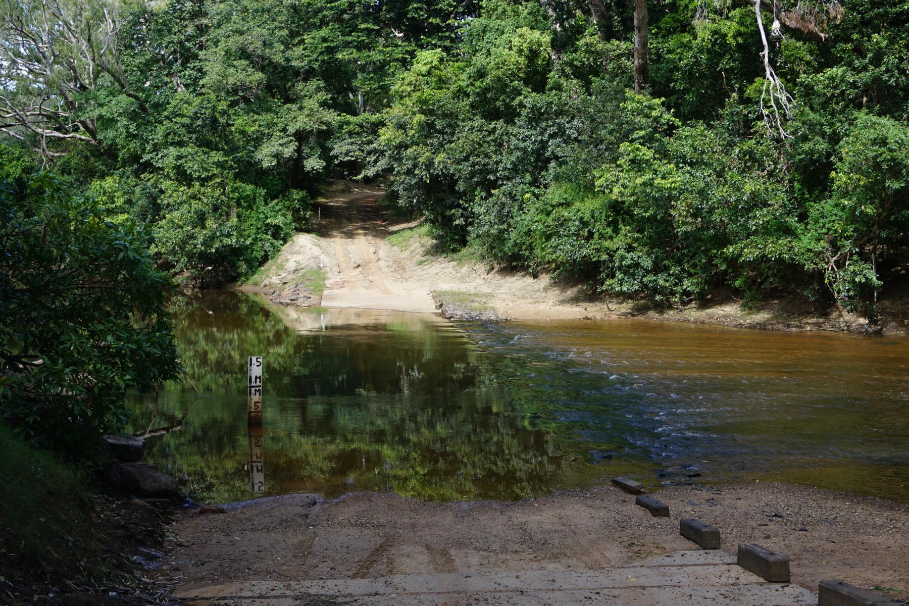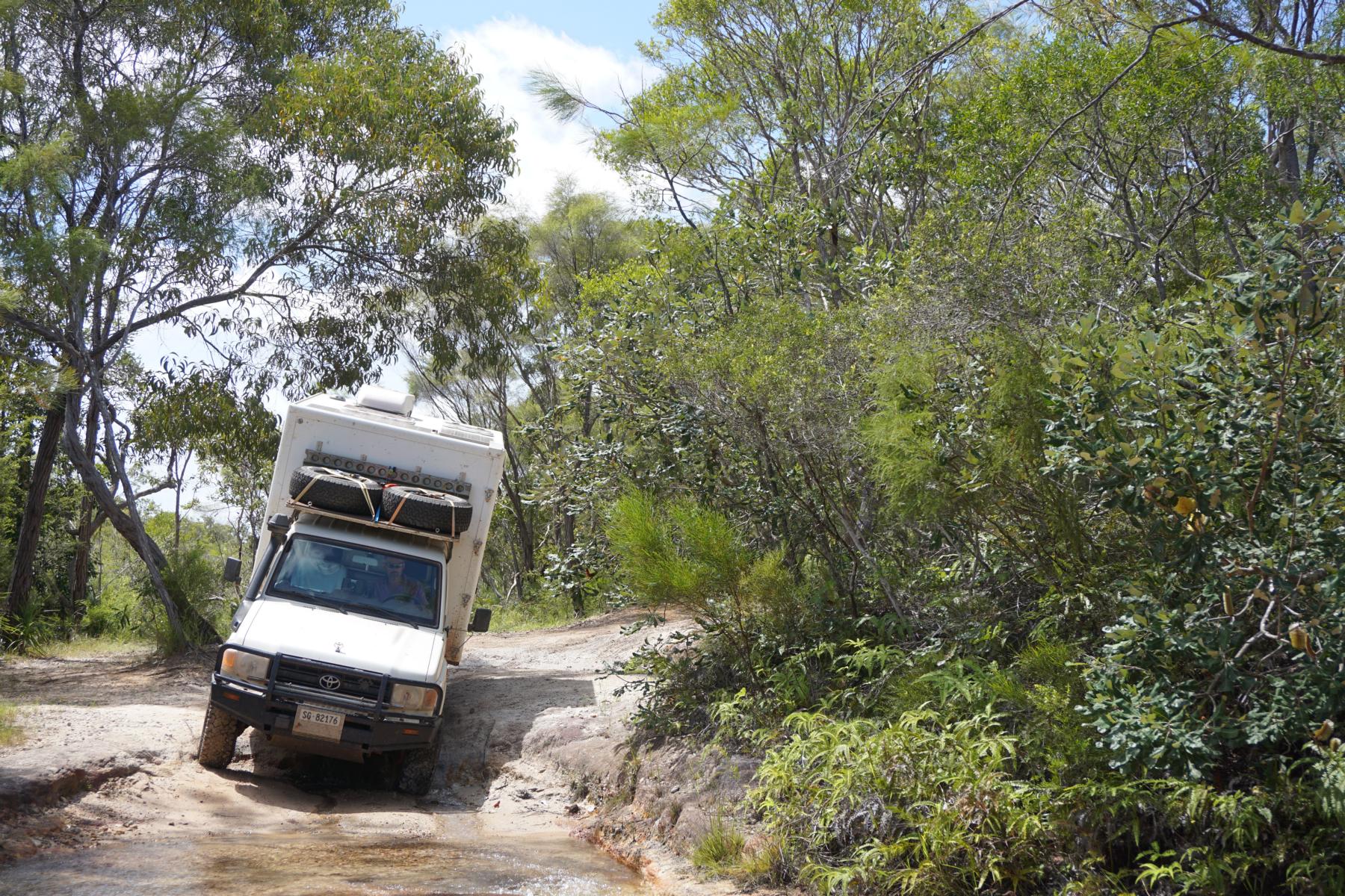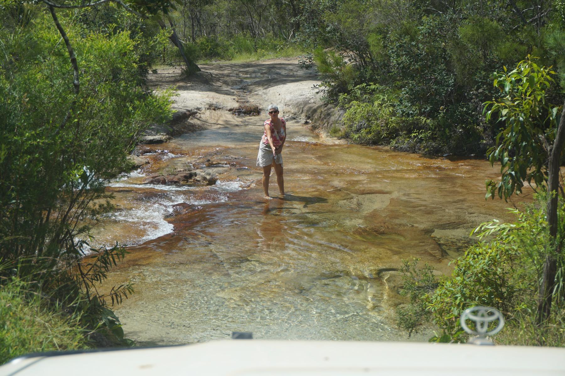 Vor allem der Sand im Bachbett sieht tückisch aus, wer weiss wie tief sich die Räder eingraben. Wir geben auf und kehren um – auf derselben unwegsamen Holperpiste zurück. Unsere Box neigt sich verdächtig mal links, mal rechts. Meine Nerven könnten das nicht stundenlang durchstehen. Ich bin froh, als wieder die rote Umfahrungsstrasse in Sicht ist. Der Old Telegraph Track ist wirklich nichts für so schwere Fahrzeuge und vor allem, wenn man alleine unterwegs ist.