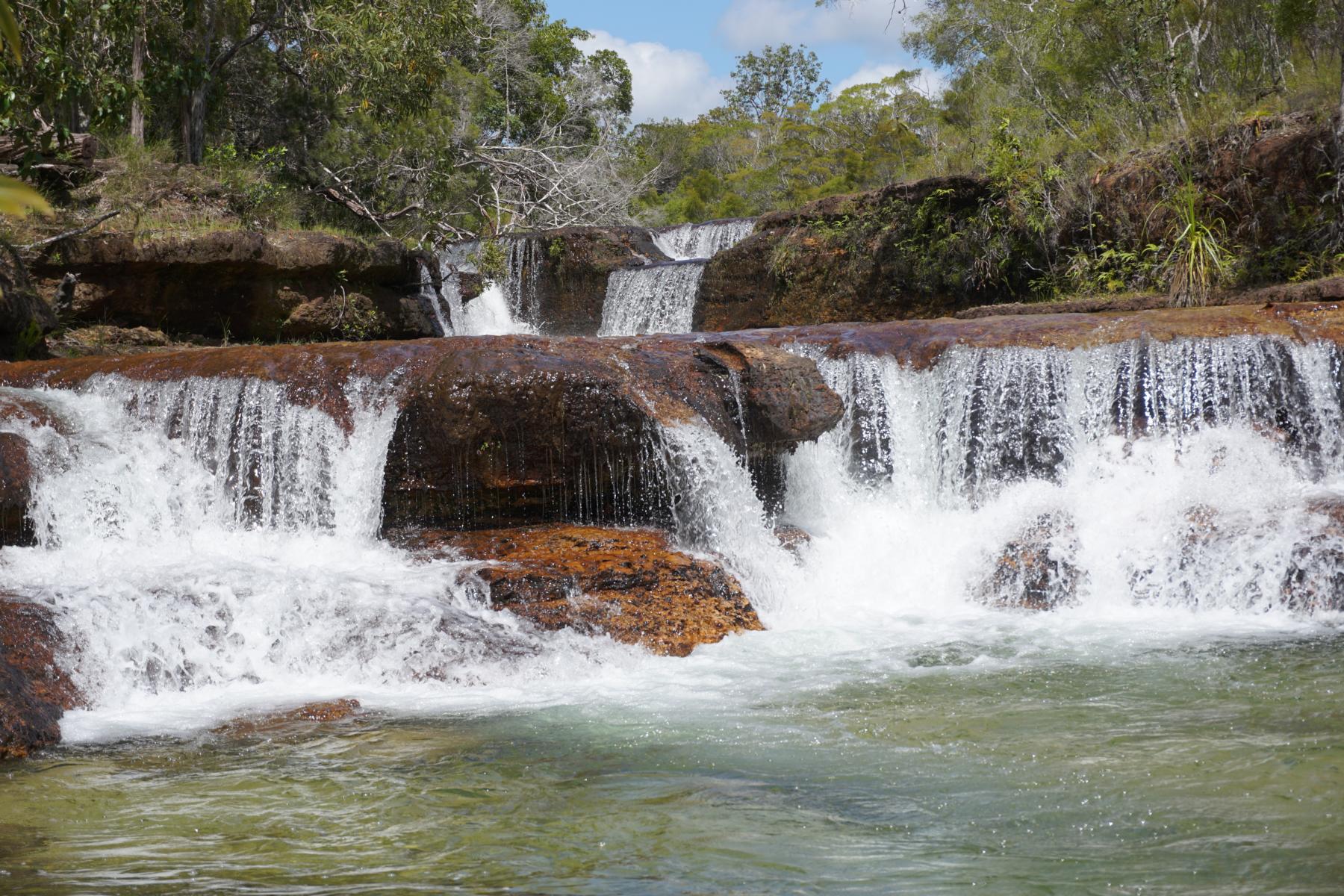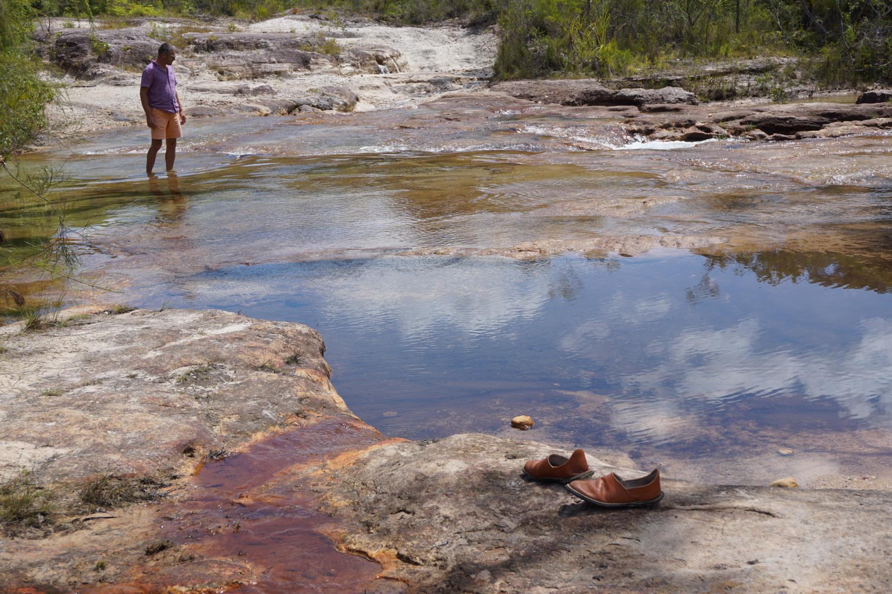 Es geht eine anstrengende, holprige Fahrt weiter zu den Elliot und Twin Falls, die fünf Kilometer entfernt sind. Glasklares Wasser, herrliche Badeteiche und keine Leute, was für ein Privileg wir haben. Mit einer Abkürzung über den Old Telegraph Track zurück auf die Umfahrungsstrasse können wir ein paar Kilometer einsparen und müssen nicht mehr denselben Weg fahren. Denken wir! Wir schaffen zwei Flussdurchquerungen, doch beim dritten Fluss wird sogar die Undi nass. Das ist definitiv zu tief.