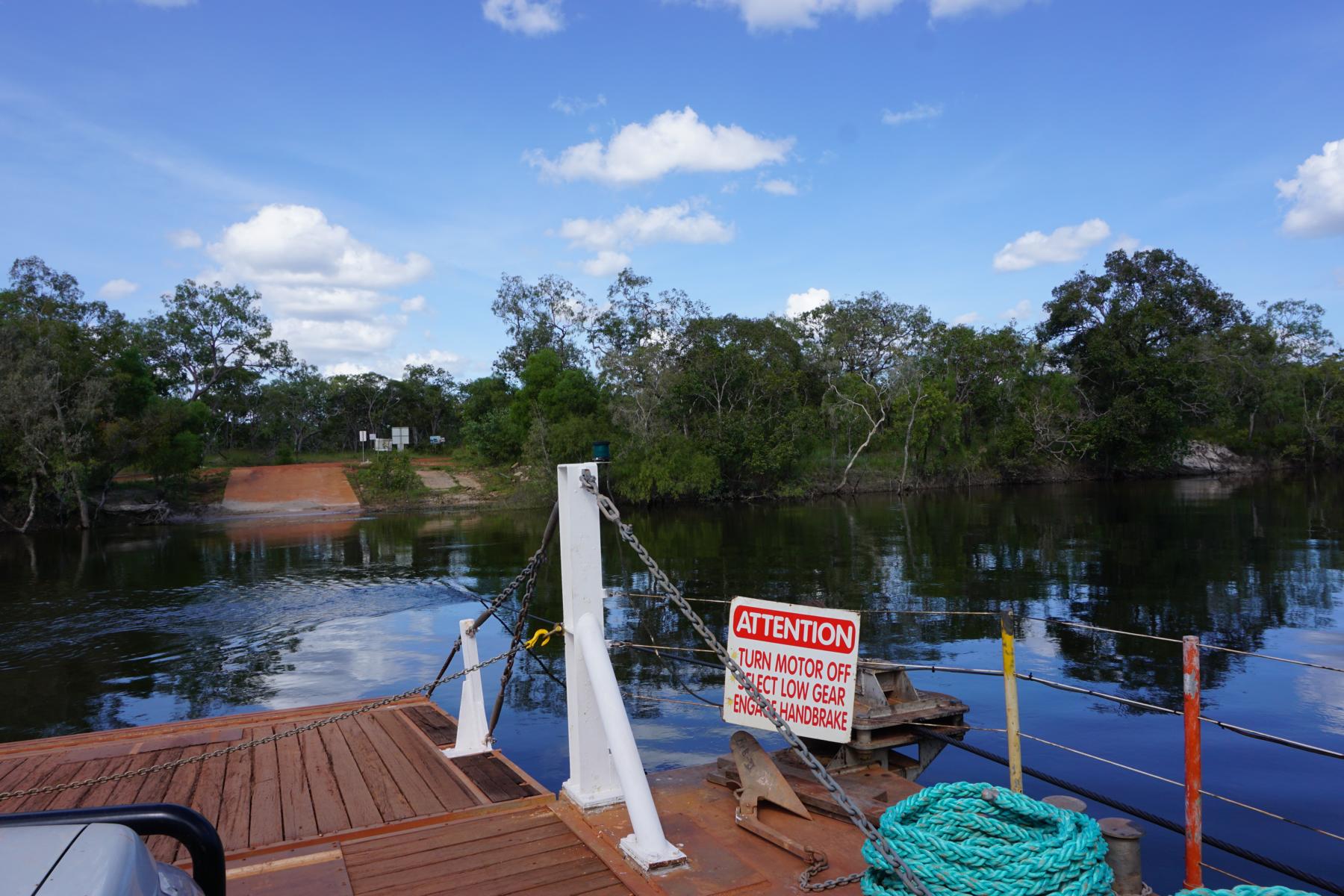 Über den Jardine River verkehrt eine Fähre, zwei komische schwarze Gestalten warten an der Tankstelle davor auf Kundschaft. Für zwei Minuten Überfahrt bezahlen wir 45 Dollar.