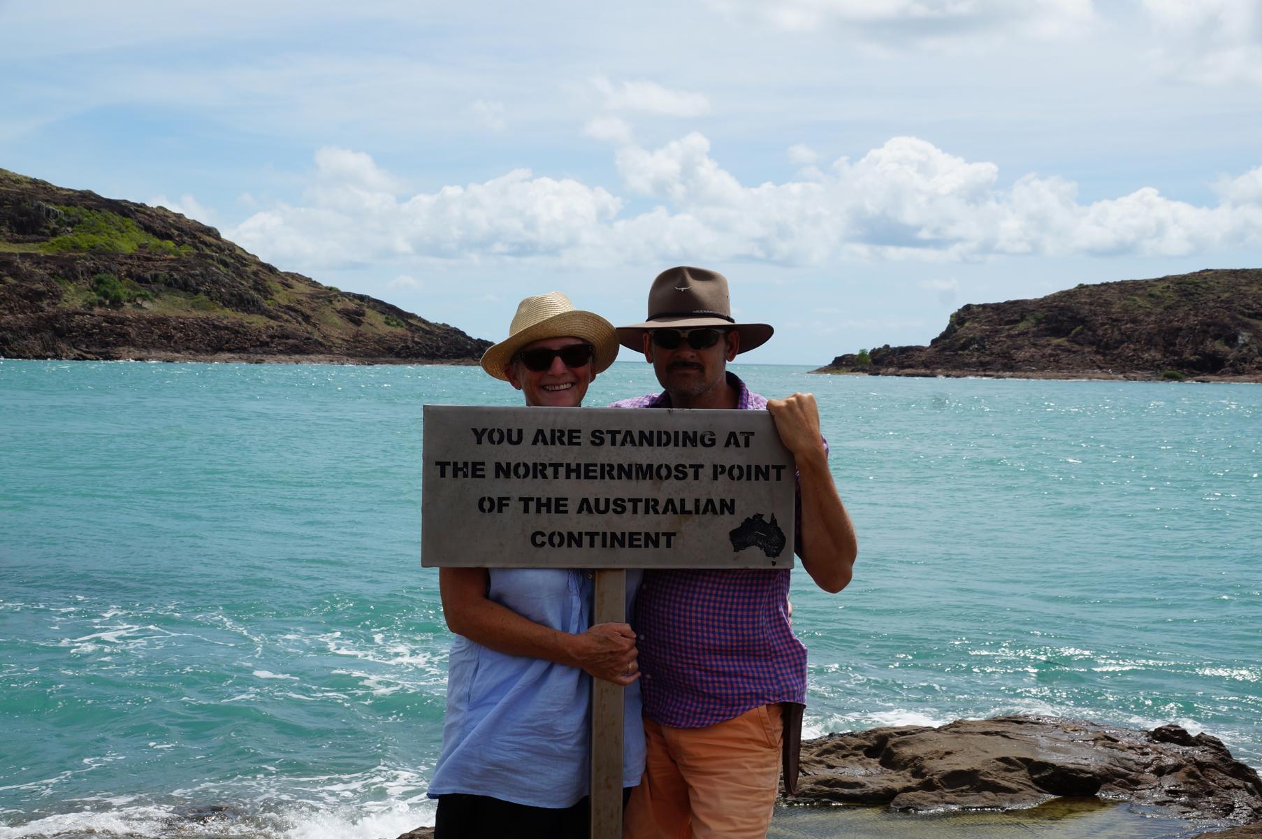 Endlich sind wir in Pajinka – Cape York Spitze – wie die einheimische Bevölkerung von das Kap nennt. Erst müssen wir noch ein paar schweisstreibende Klippen erklimmen, bis wir vor dem weltberühmten Schild stehen. Drei Meere treffen hier zusammen: das Arafura Meer, das Torres Strait Meer und der Südpazifische Ozean. In Sichtweite liegen Inseln verstreut im türkisblauen Meer, ein ergreifendes Gefühl an dieser Spitze des Kontinents zu stehen. Die australische Frau klärt uns auf, dass dieser Ort eines der Reiseziele jedes Australiers sei, bevor er diese Welt verlässt. We made it!