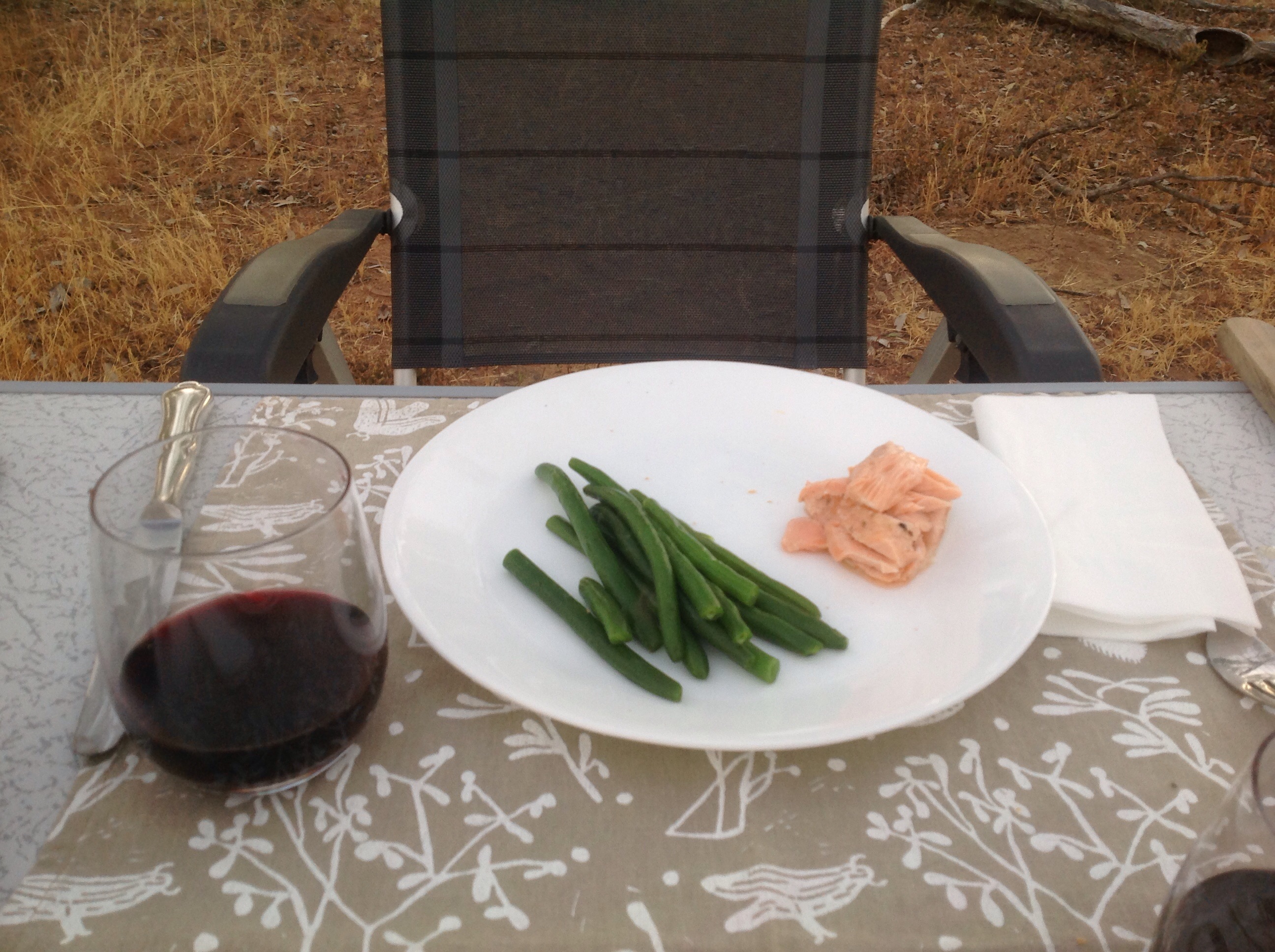 Gang Nummer 3: Lachsfilet und grüne Bohnen. Und natürlich eine feine Jubiläumsflasche Wein. Paul hat heute seine Portion Shell bekommen :-)!