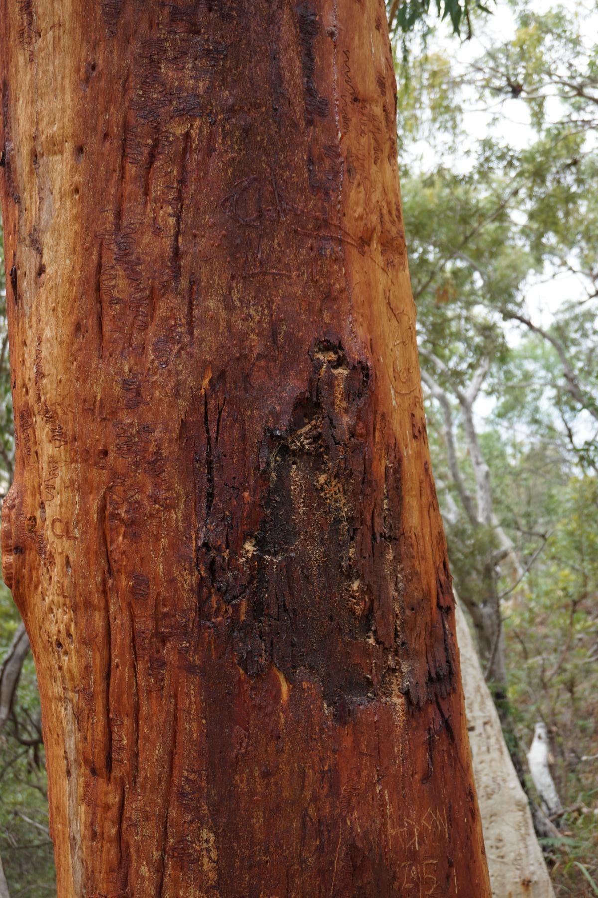 Dunkelorange Rinde eines Eukalyptusbaumes.