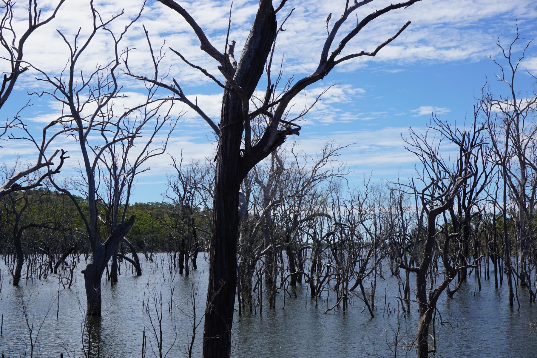 Gespenstische Bäume im See. Sie haben während der Flut definitiv zuviel Wasser bekommen.