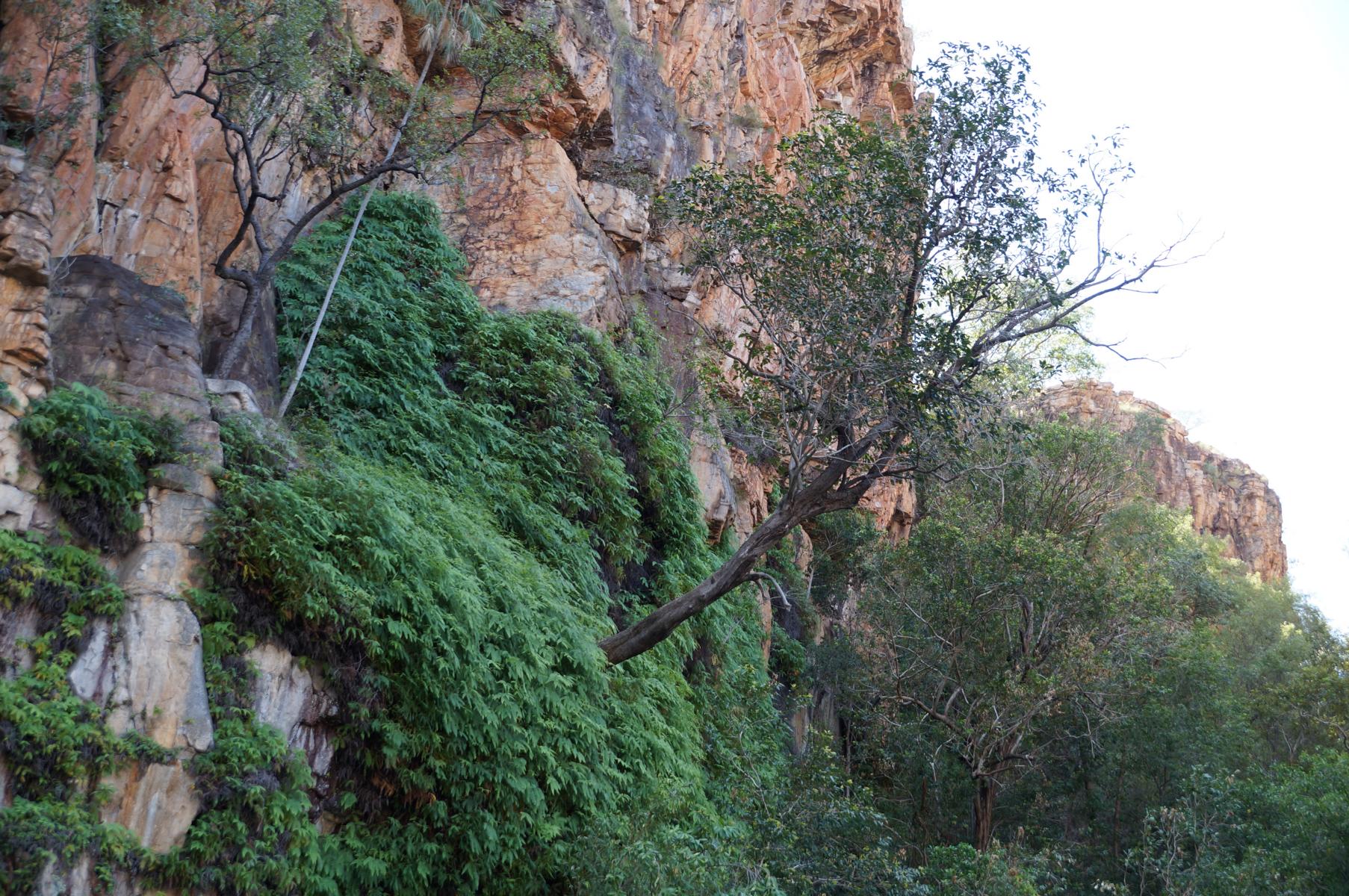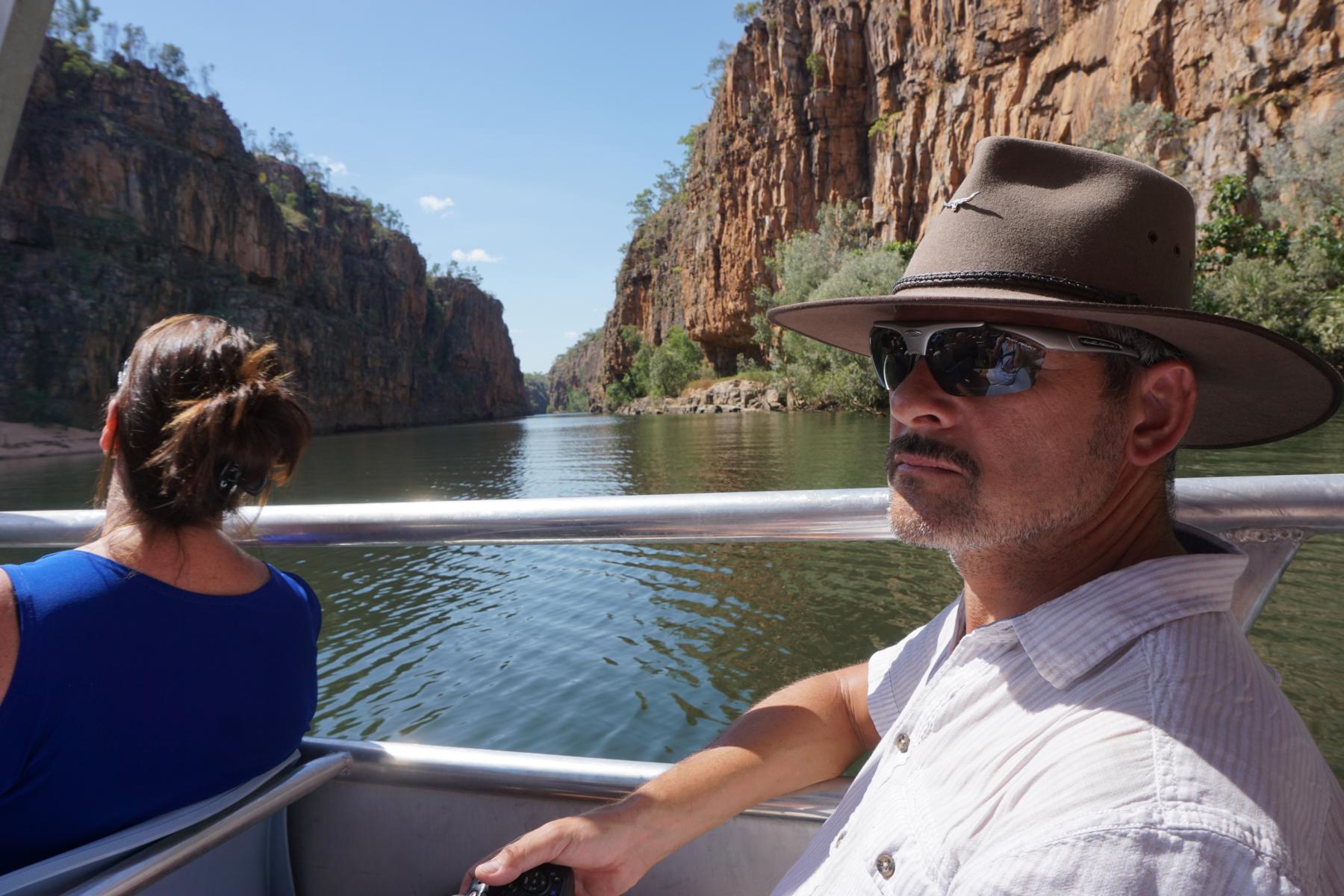In der Katherine Gorge unternehmen wir eine Tour mit dem Boot durch zwei der dreizehn Schluchten. Halt mit anderen Touristen – da gibt es keine andere Möglichkeit (ausser endlosen Wanderungen). Die Sandsteingebilde der Schlucht ragen imposant in den Himmel. Endlich sehen wir auch die bis jetzt nur auf den Warntafeln aufgeführten Krokodile im Sand an der Sonne liegen.