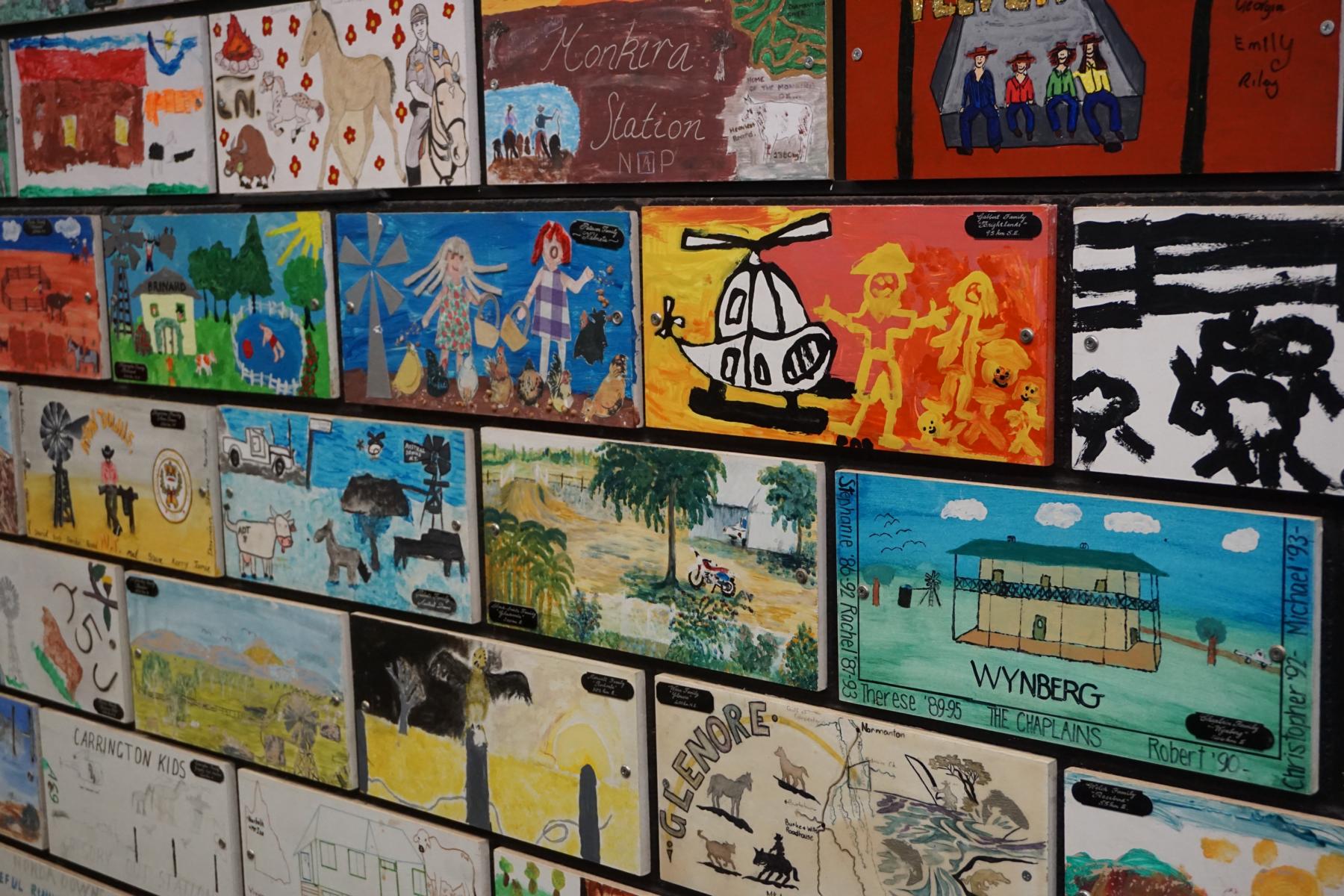 Die Kinder wohnen in alle Richtungen verstreut, bis 500 Kilometer entfernt auf einer Farm. An der Wand hängen Fotos von ihrem Schulzimmer zu Hause. Hier lernen sie ergänzend zum Telefonunterricht in Eigenregie oder mit Unterstützung der Eltern. Ein Junge hat sich seine Schulbank unter einem Baum eingerichtet, weitab vom Lärm des Generators.