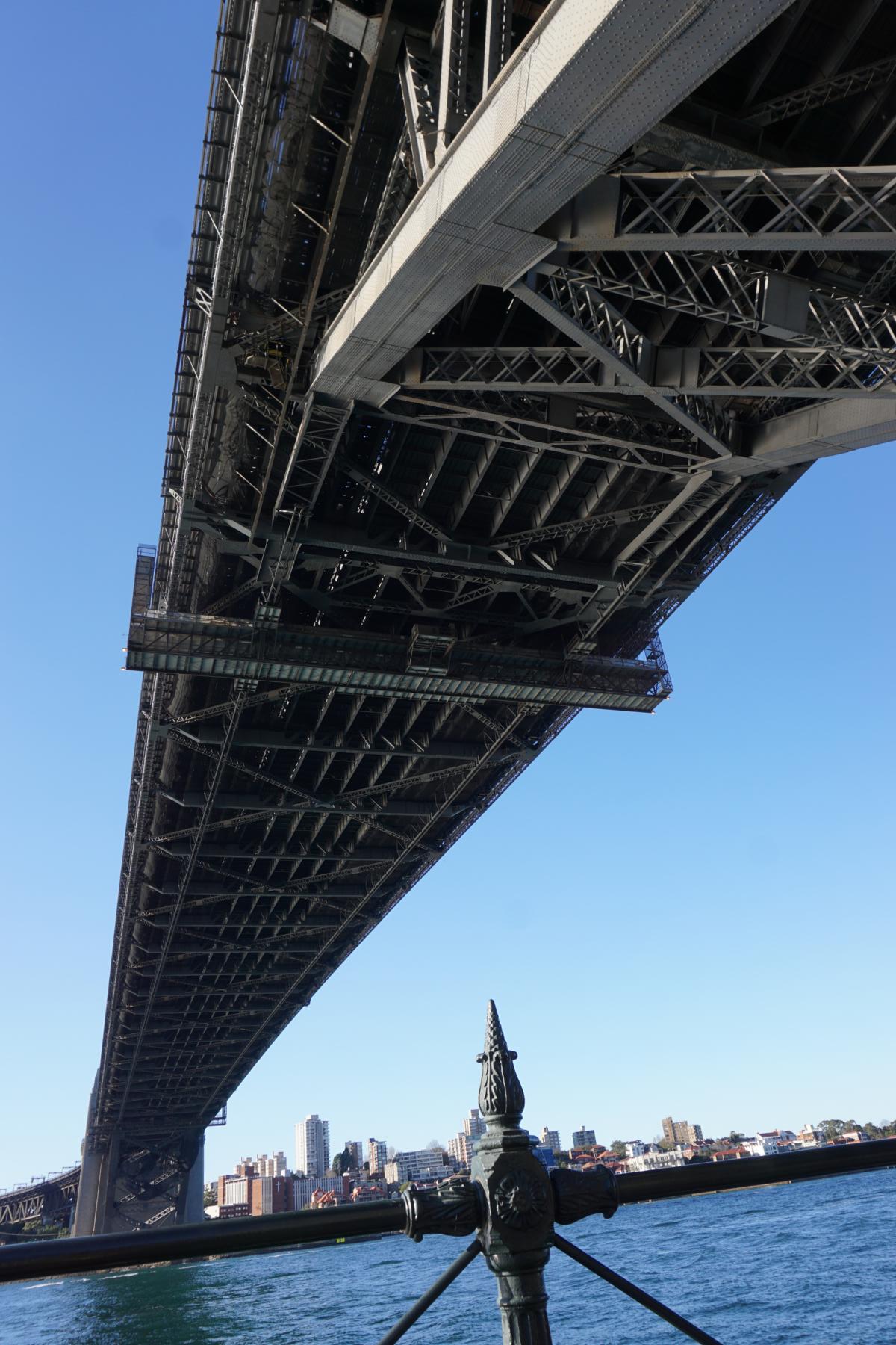 Heute zuerst mit dem Auto über die Brücke, dann zu Fuss, mit der Fähre und schliesslich mit dem Dinner-Schiff unter der Brücke.