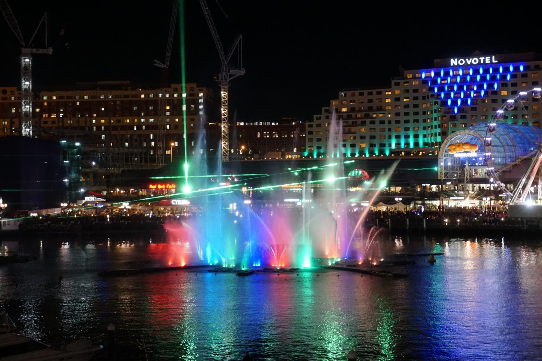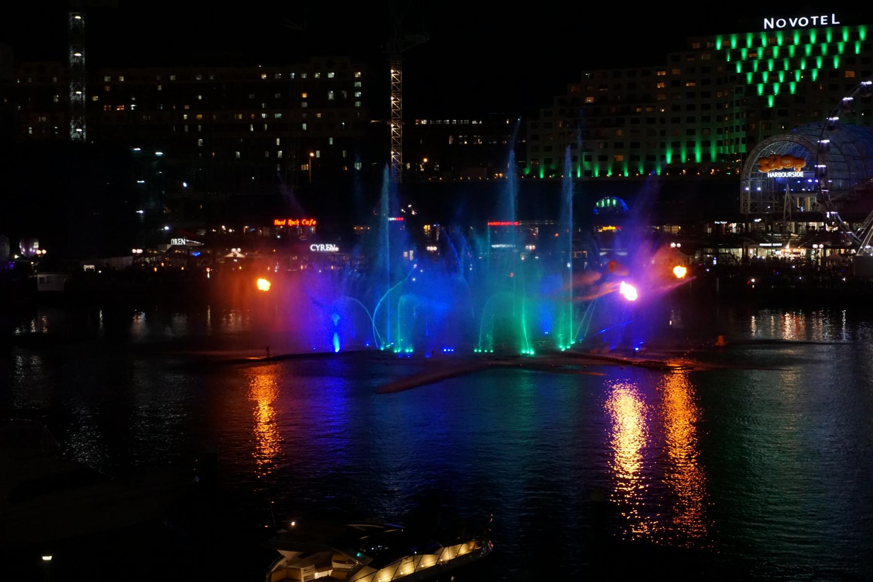 Im Wasser widerspiegeln sich die Farben der Springbrunnen-Inszenierung.
