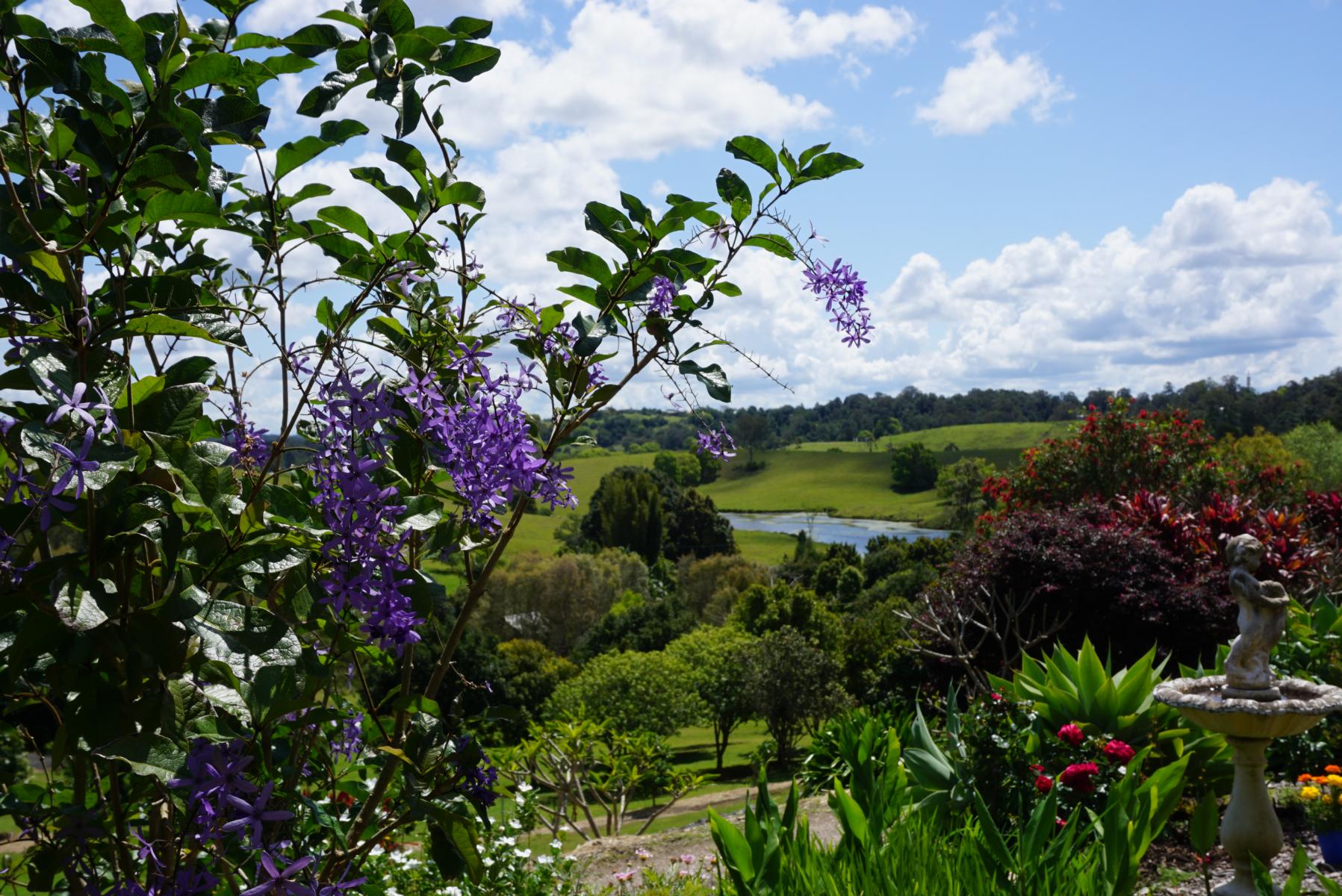 Die erste Anlaufstelle nach unseren langen Campingtagen sind Sylvia und Walti in Queensland. Dass es bei unserer Ankunft wie aus Kübeln regnet (das zweite Mal innerhalb von acht Wochen), macht den Besuch in einem richtigen Haus noch angenehmer. Wir geniessen es, eine eigene Dusche/WC zu haben, an einem mächtigen, stabilen Tisch zu sitzen, uns mit anderen Menschen zu unterhalten. An der Sunshine Coast haben sich gleich ein paar Schweizer, Deutsche und Österreicher niedergelassen, die sich alle kennen. Und das Buschtelefon funktioniert: wir werden zu Kuchen und zum Znacht eingeladen. Die Wiesen sind grün, die Teiche mit weissen und violetten Seerosen getüpfelt, der Garten eine Pracht. Das tut den Augen gut nach Staub und dürren Gegenden. Der Spaziergang durch die Regenwald-Oase Mary Cairncross ist ein Erlebnis im Einklang mit der Natur.