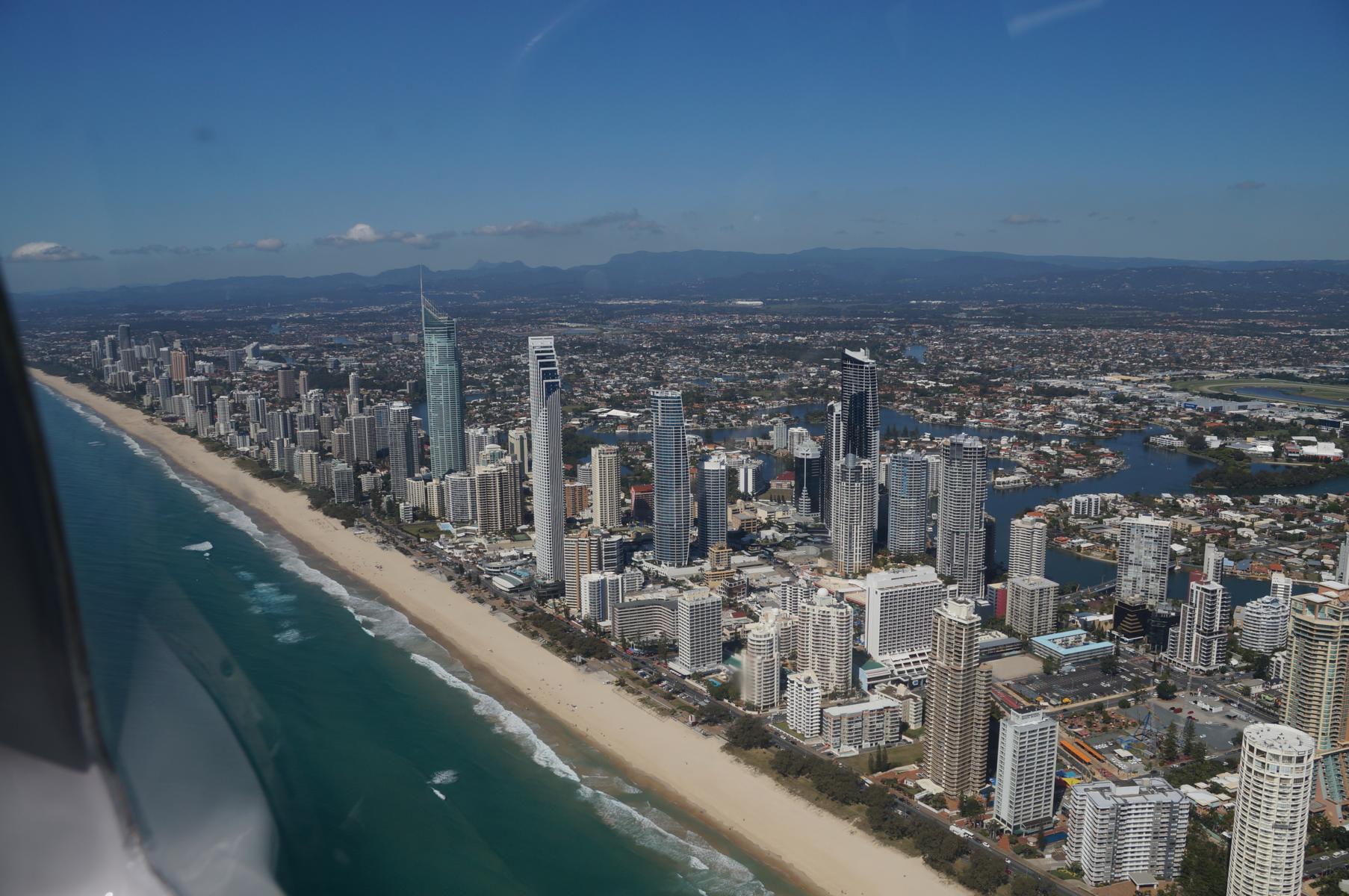 Die Fahrt geht weiter nach Brisbane zu Susi und Hannes. Auch hier ist es klar, dass wir bleiben. Am nächsten Tag wartet ein Höhepunkt auf uns. Hannes besitzt ein Kleinflugzeug und fliegt mit uns über grüne, perfekt ausgerichtete, Zuckerrohrfelder und die gigantischen Bauten der Gold Coast. Auf unserer Reise vor ein paar Monaten durch diese Gegend war uns schon bewusst, dass diese Hochhäuser grandios sind, doch von oben sehen sie nochmals luxuriöser, pompöser aus. Vier Starts, vier Landungen – wir haben den Flug gut überstanden und ein einmaliges Schauspiel aus der Vogelperspektive erlebt. Am Nachmittag bestaunen wir die Architektur von Brisbane. Die Stadt beim Einnachten im Glanz der Lichter zu sehen ist etwas Besonderes.