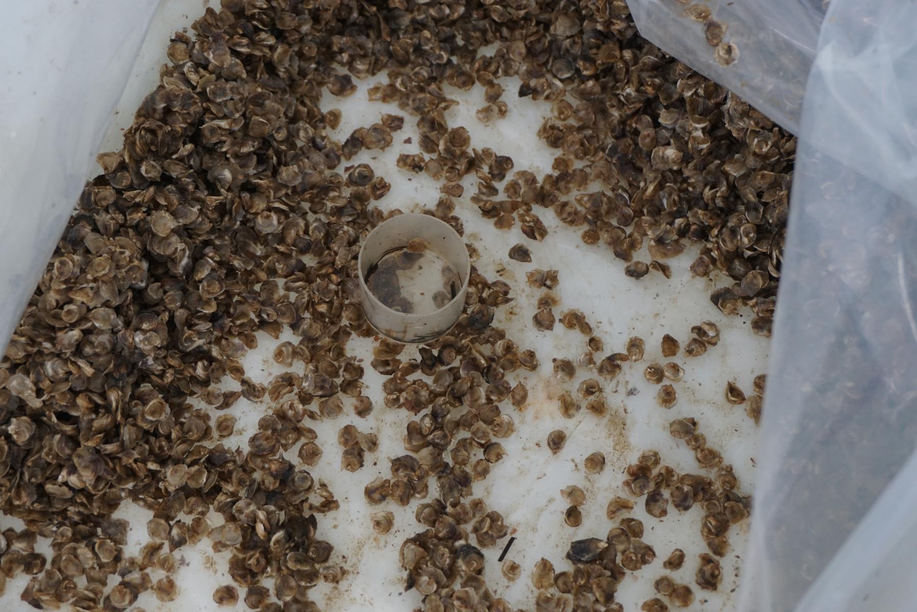 Unsere Augen leuchten, als wir das Schild vom Austernverkauf lesen, die müssen wir natürlich auch haben. Vier Männer sind gerade dabei, ein paar Millimeter grosse Austern in ein Kunststoffgeflechtrohr zu füllen. Darin werden sie 18 Monate heranwachsen, bis sie zum Verkauf bereit sind.