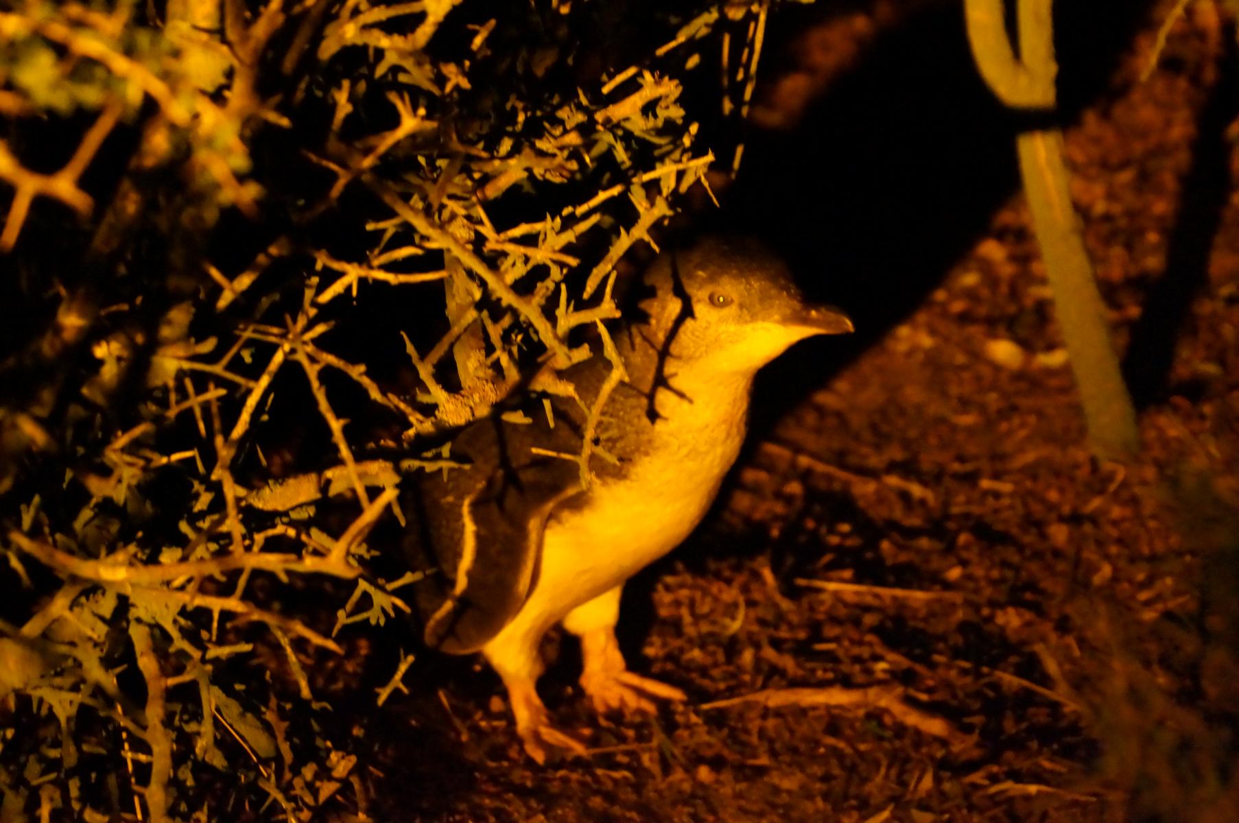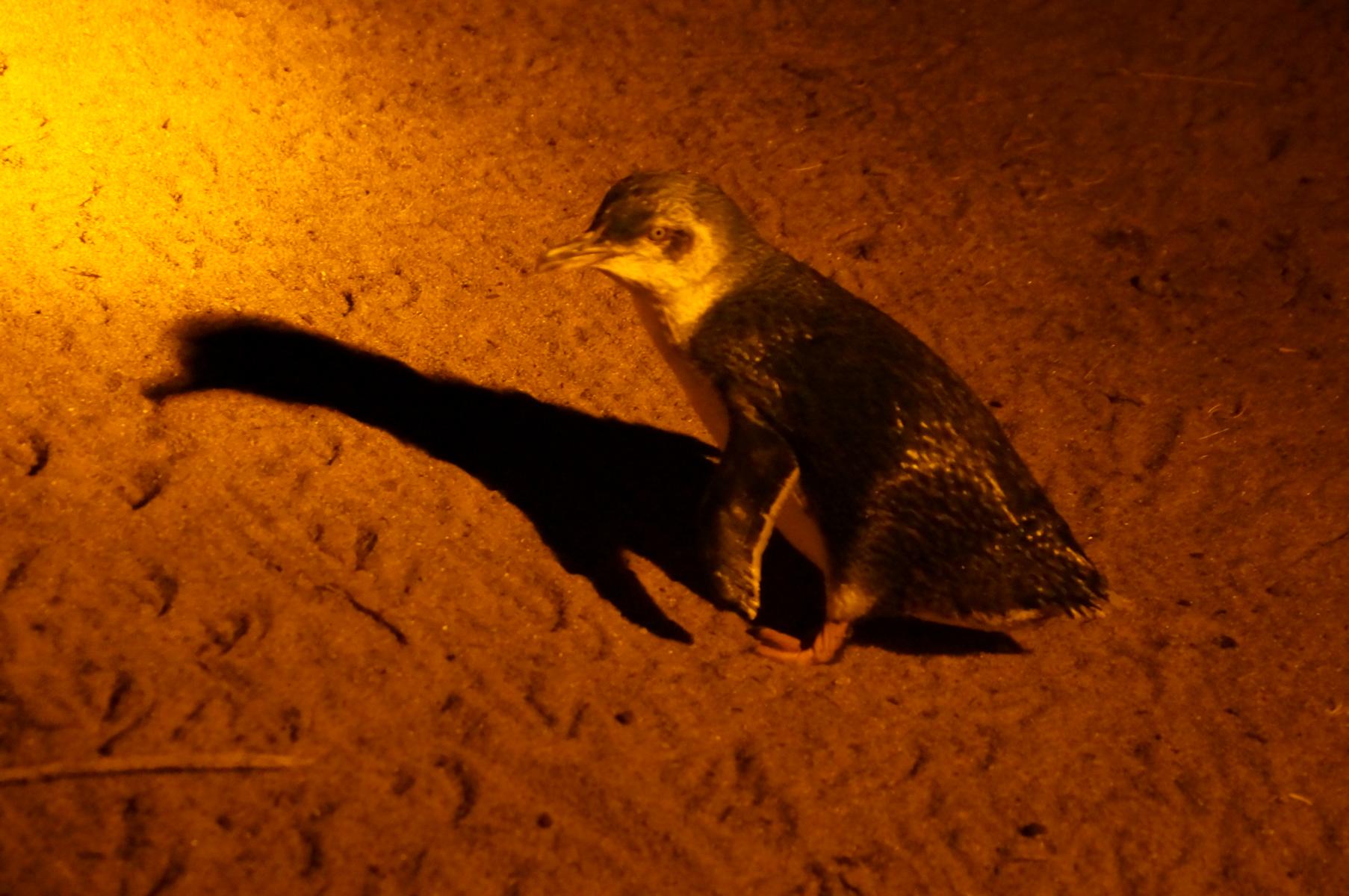 Es ist Abend fünf vor acht. Wir entschliessen uns kurzfristig, den Pinguinen einen Besuch abzustatten. Sie kommen beim Einbrechen der Dunkelheit von ihrem Fischfang zurück. Alles muss schnell im Auto an seinem Platz verstaut werden, denn bei der kleinsten Kurve fliegen Schubladen und Schranktüren auf. Wir schaffen es noch rechtzeitig. Mit einem Führer und natürlich ein paar anderen Touristen wandern wir zum Strand. Ein kleiner weisser Golfball schaukelt in den Wellen – es ist der Bauch des Pinguins. Diese Sorte Pinguine ist ca. 25 bis 30 Zentimeter klein und nur ein Kilogramm schwer. Zur Zeit ist Brüte- und Aufzuchtzeit.
