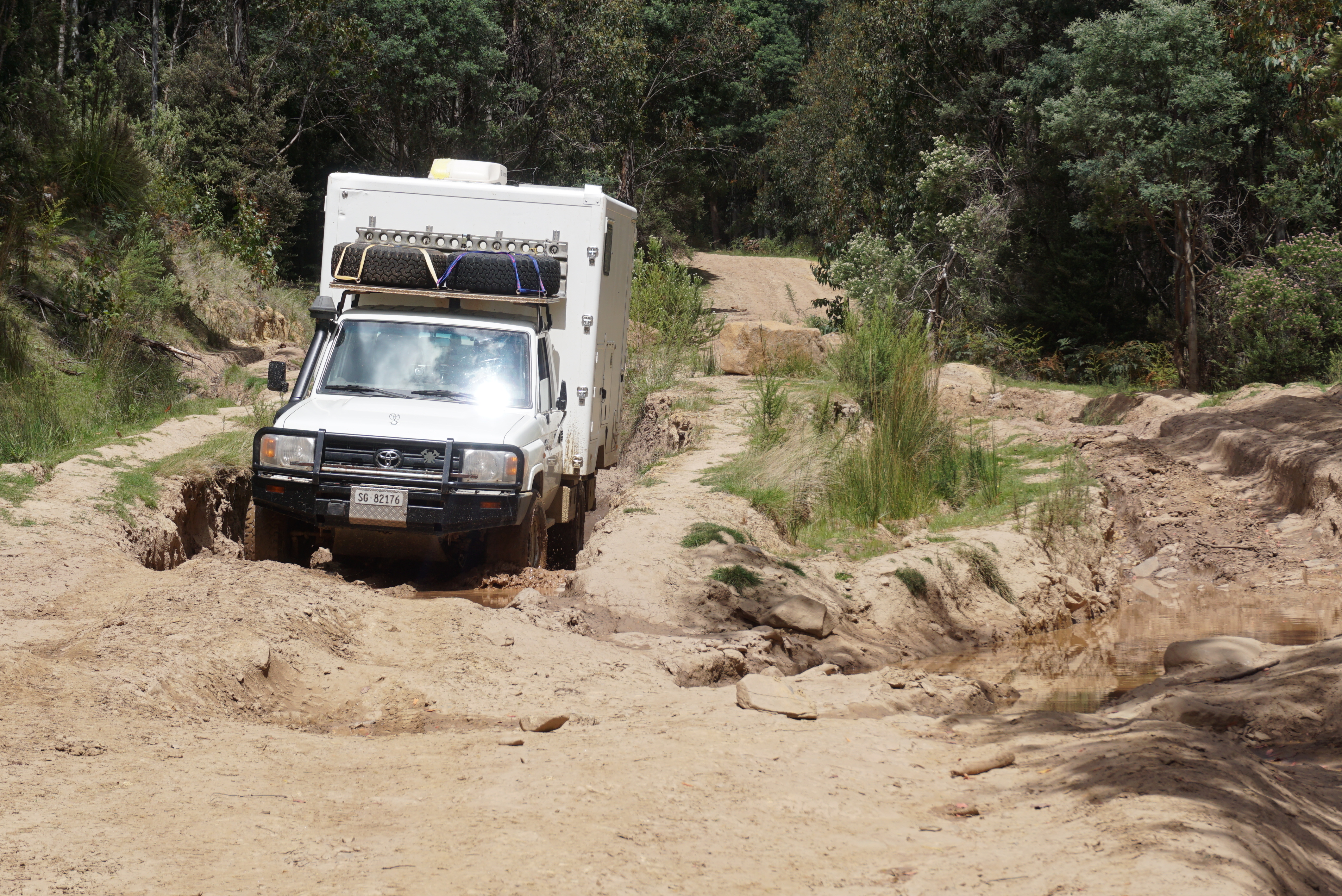 Bis dann die Wasserlöcher, die Schlammspuren und -rinnen folgen …. Was für ein Desaster. Wir sind davon ausgegangen, diese harten Strecken hinter uns zu haben, doch nein, dies ist definitiv die härteste Herausforderung. Mir bleibt das Herz auch ausserhalb des Autos fast stehen.
