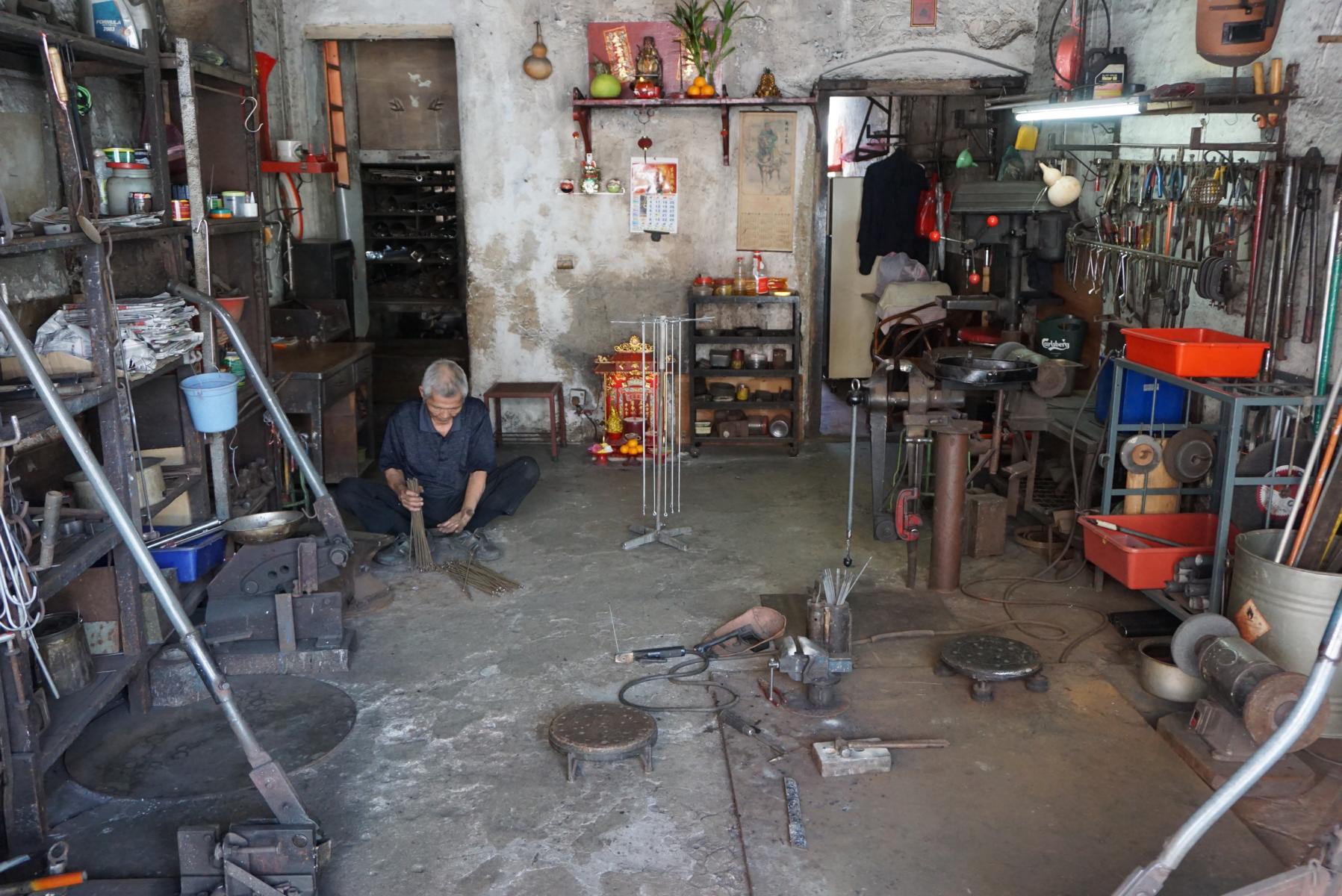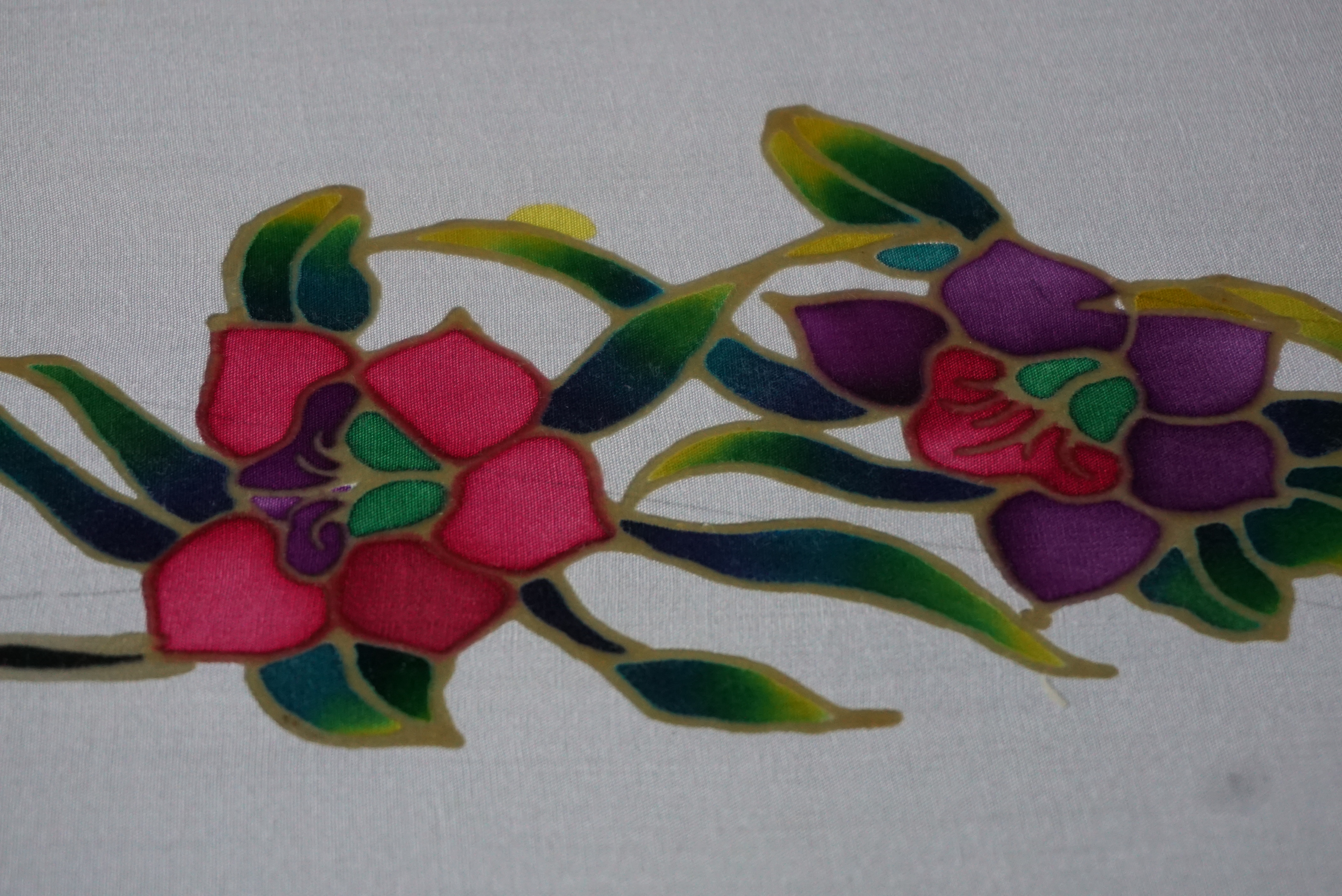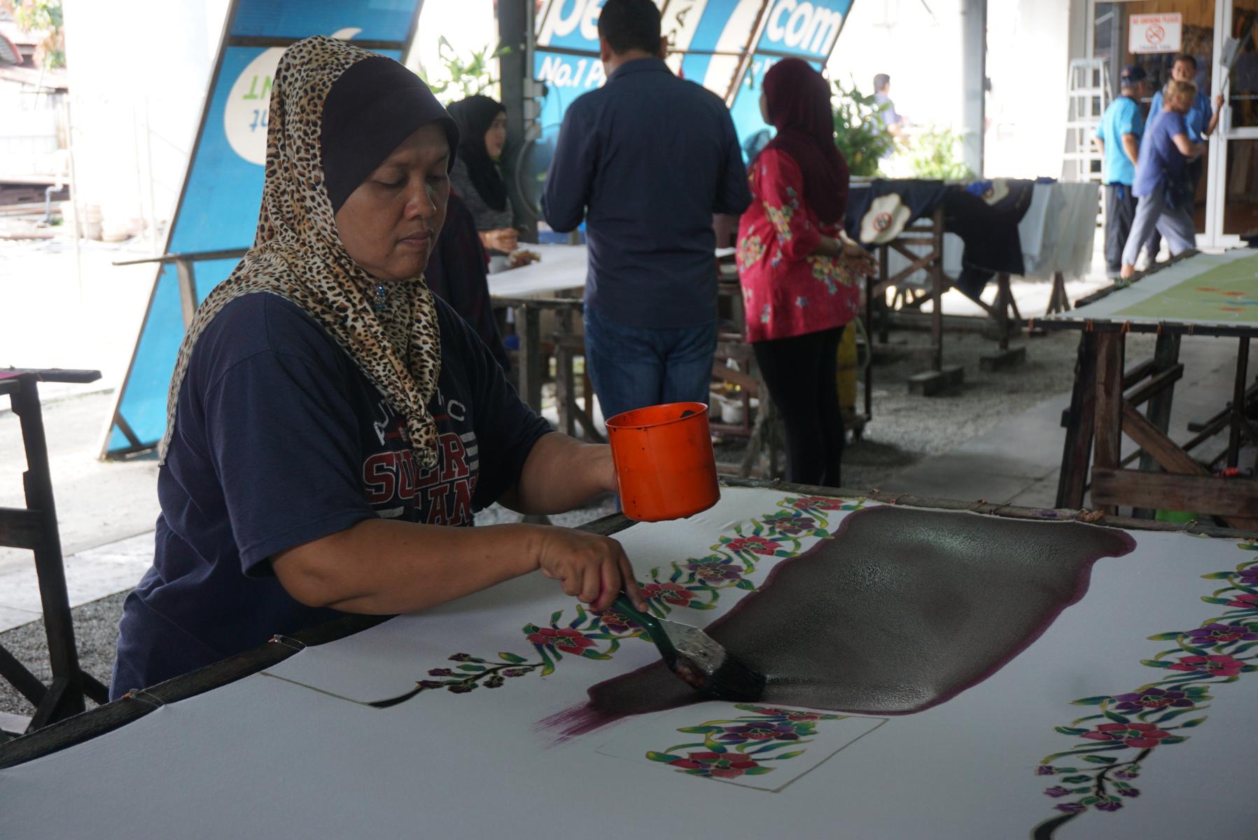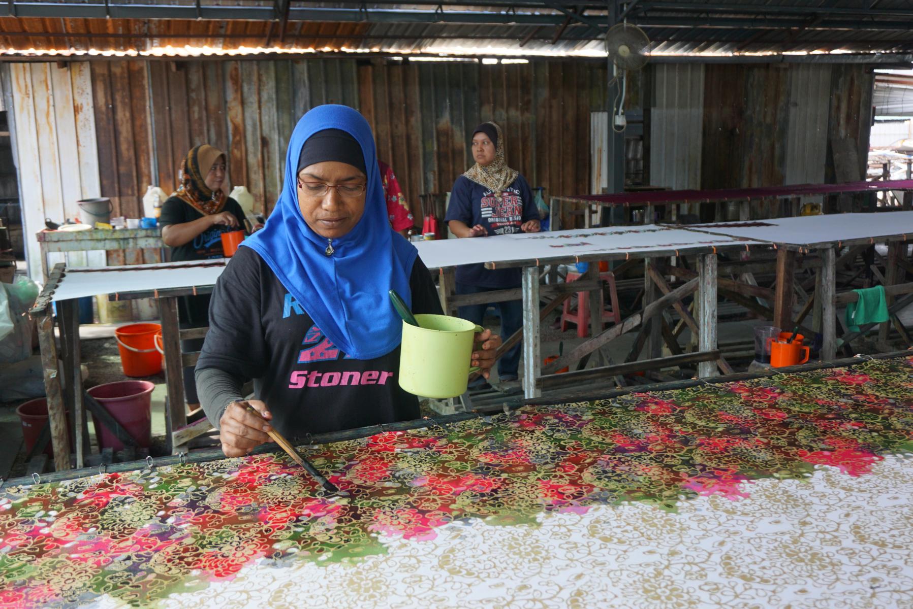 Stoffe mit bunten Farben und kunstvollen Ornamente entstehen in der Batikfabrik. Die Frau trägt den Wachs mit geschickter Hand und ohne Zeichnung auf, andere tupfen die Farben auf den vorbereiteten Stoff. Es entstehen Vorhänge, Kleiderstoffe, Tischdecken, Blumen sind beliebte Motive.