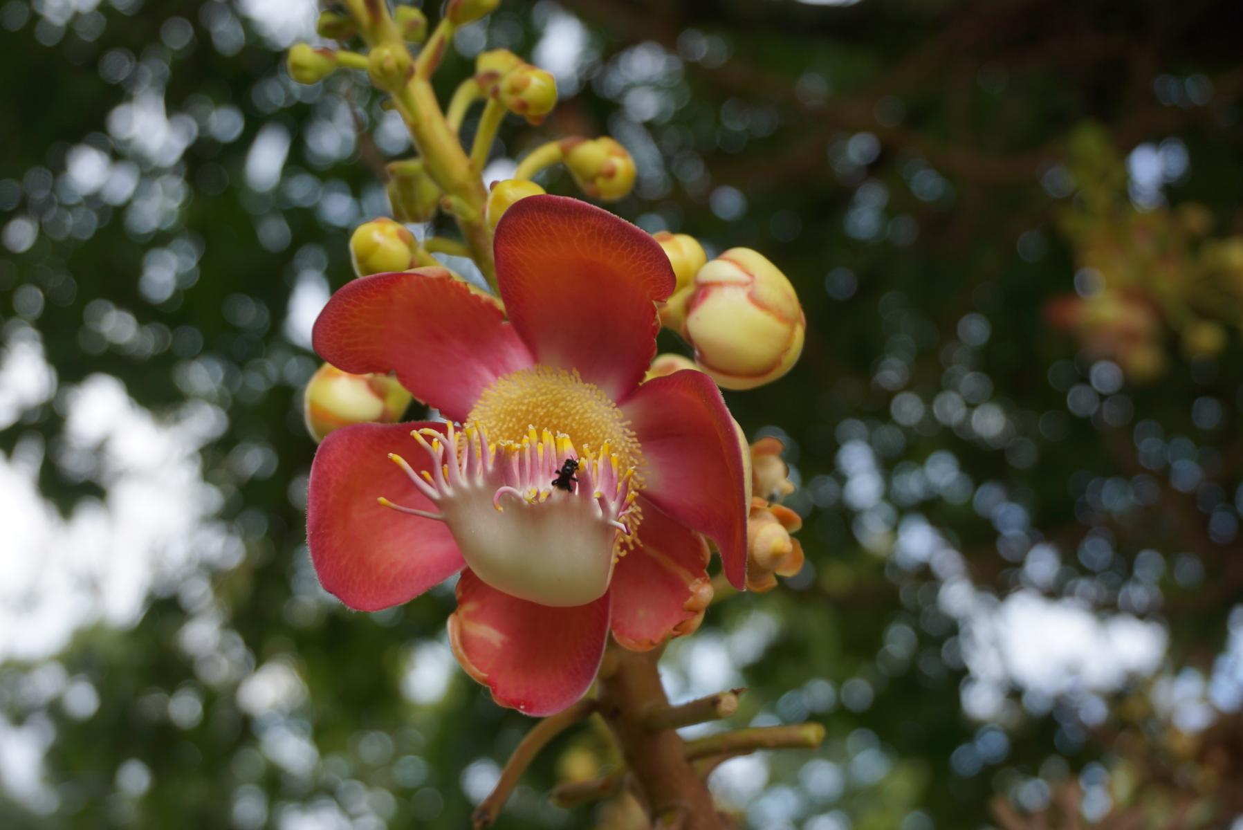 Auf dem 10 Hektaren grossen Gelände der tropischen Fruchtfarm werden 200 tropische Früchte in steilen Terrassen angelegt. Plötzlich färbt sich der Himmel grau und ein heftiger Regenguss platscht herunter. Zum Glück sind wir unter Dach und geniessen die tropischen Früchte und Säfte. Jetzt müssen wir allerdings die Wanderung in den Anlagen vergessen.
