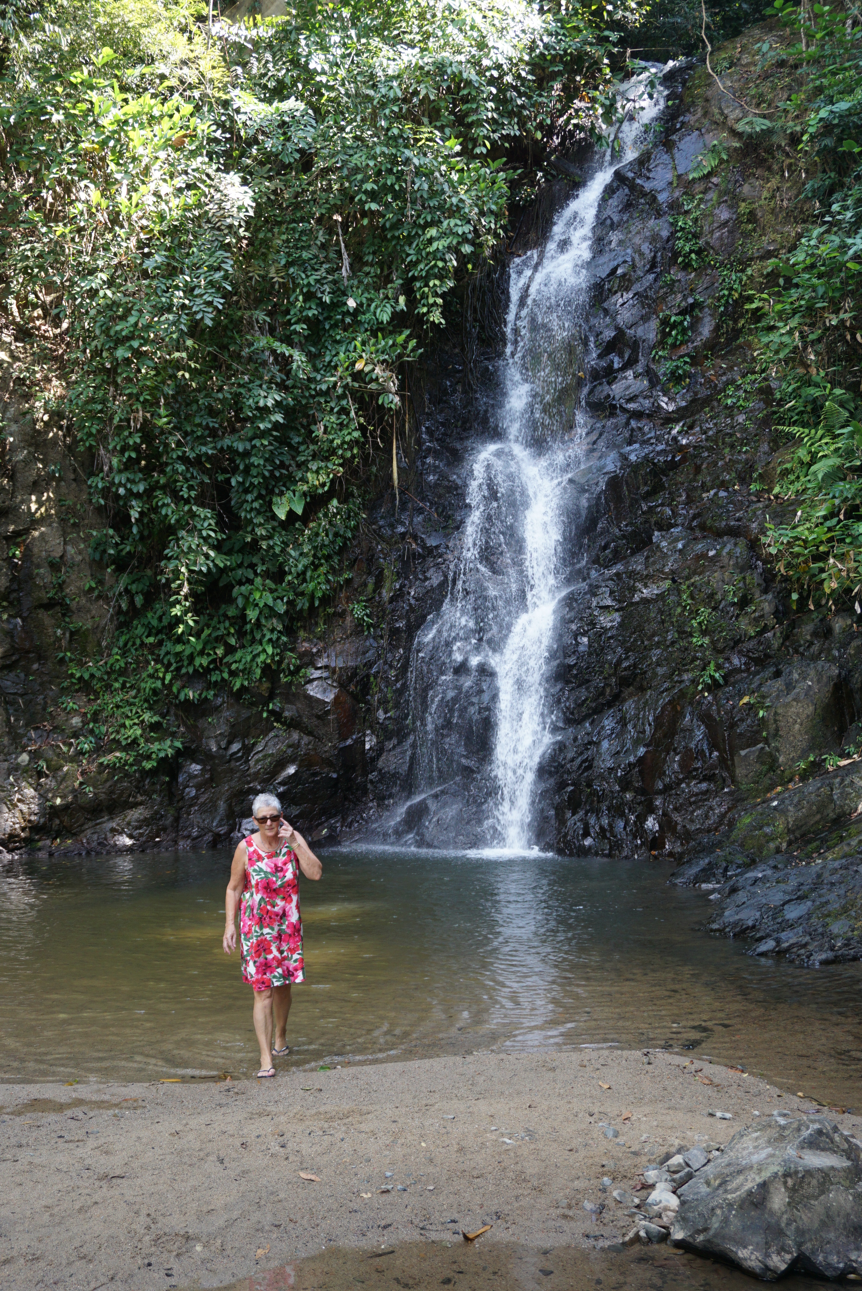 Unzählige Stufen führen hinauf zum Fall. In der Höhe ist eine Putzmannschaft in orangen Kleider daran, die dürren Blätter mit einem dünnen Besen herunterzuschieben. Der Wasserfall führt schon Wasser, doch nicht überwältigend. Das Wasser ist ziemlich aufgewühlt und trüb – es macht uns nicht an, ein Bad zu nehmen.