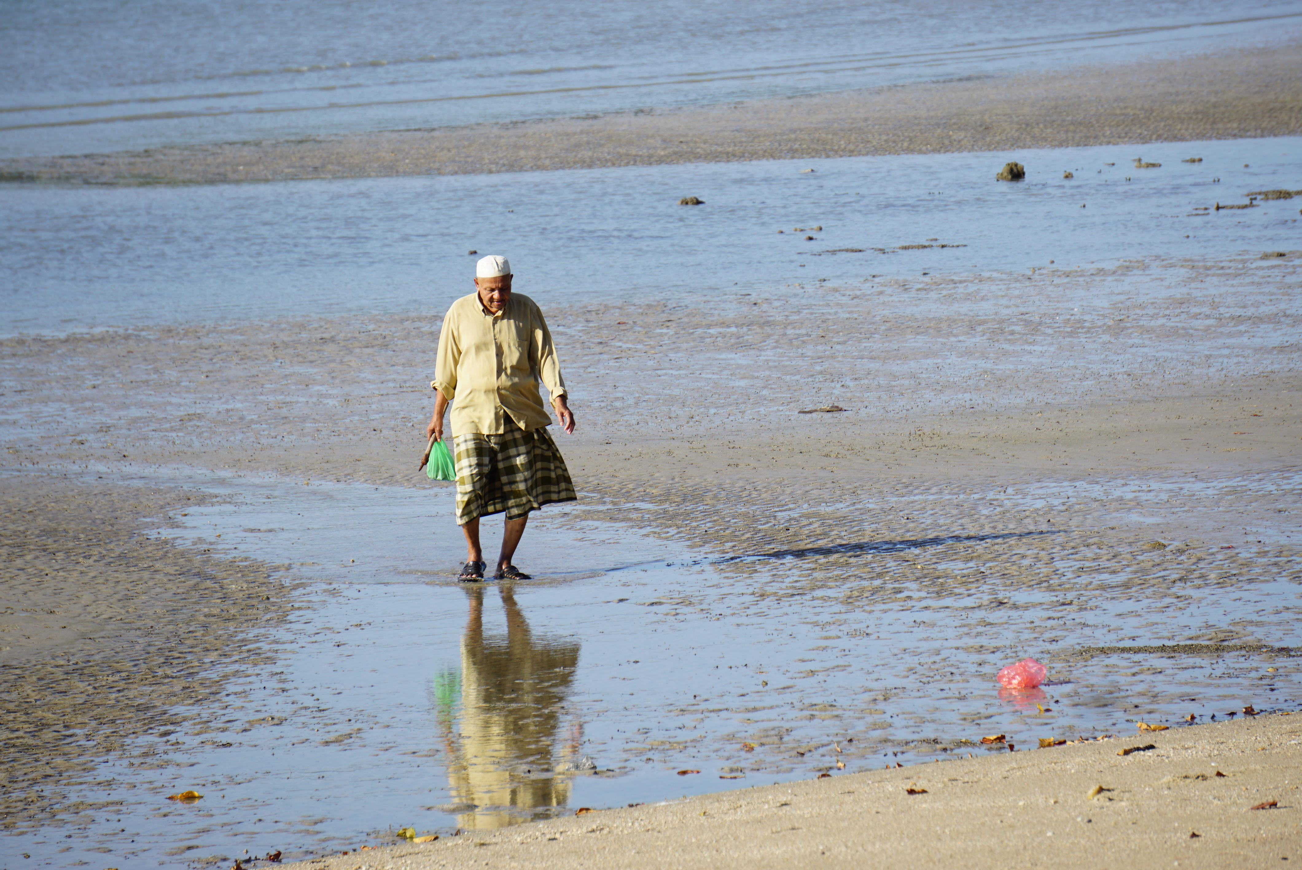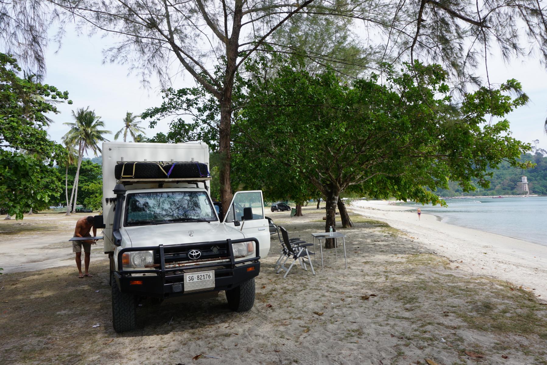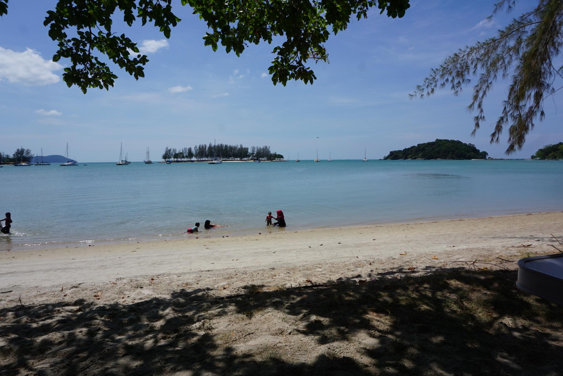 Unsere erste Inselrundfahrt führt uns in den Westen, bis uns ein gold-schwarzes Tor den Weg versperrt – private property! Ein grosszügig angelegter Golfplatz lockt die Luxustouristen in The Datai Langkawi Resort und ins Andaman Resort. Definitiv eine Kategorie über unserem Budget. Am Morgen bei der Durchfahrt haben wir einen öffentlichen Strand mit hohen Bäumen gesehen und da fahren wir jetzt wieder zurück und platzieren Paul unter einer schattenspendenden Pinie. Etwas weiter entfernt steht ein Campingtrailer, umgeben von Zelten und Blachen – wir sind also nicht alleine. Und bleiben es auch nicht. Der Malaysier kommt uns besuchen und erzählt von seinem Militäreinsatz in England und Deutschland. Er kann sogar noch ein paar Worte deutsch. Wenn wir belästigt werden, sollen wir zu ihm kommen, er ist Major und weiss mit frechen Leuten umzugehen. Das ist ja eine Beruhigung. Es ist friedlich hier, einzig der Müll, den die meisten einfach liegenlassen, stört. Doch pünktlich am Morgen kommt die Putzmannschaft und räumt den ganzen Strand sauber.
