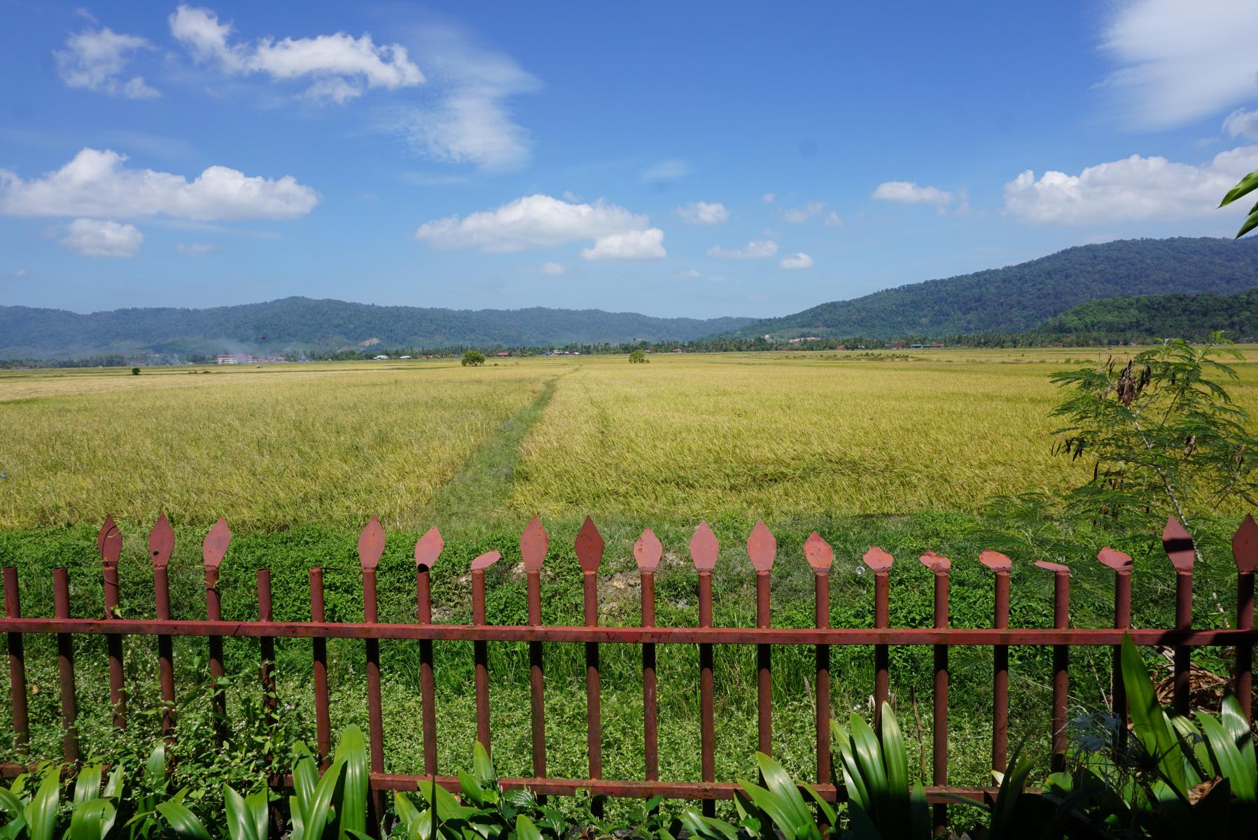 Es ist lieblich, über Land zu fahren. Viele Reisfelder in Gelb- und Grüntönen – je nach Reifestadium – kleine Dörfer, herzig angelegte Mini-Gärten, Kokospalmen, Bananenstauden und üppiges Grün sind zu sehen. Alles ist etwas überdimensioniert: riesige Blätter, hohe Bäume, wuchernde Ranken. Ein paar Kühe grasen. Vor einem Restaurant stehen viele Autos, da kehren wir auch ein und bedienen uns vom Buffet, natürlich werden wir von allen Seiten beobachtet. Gegessen wird in Malaysia mit Löffel und Gabel oder mit den Fingern. Irgendwie bringen wir auch so das Pouletfleisch vom Knochen. Es schmeckt ganz gut. Nach dem Tipp von Lorenz fahren wir zum Durian Wasserfall und müssen uns diesen erst erkämpfen.