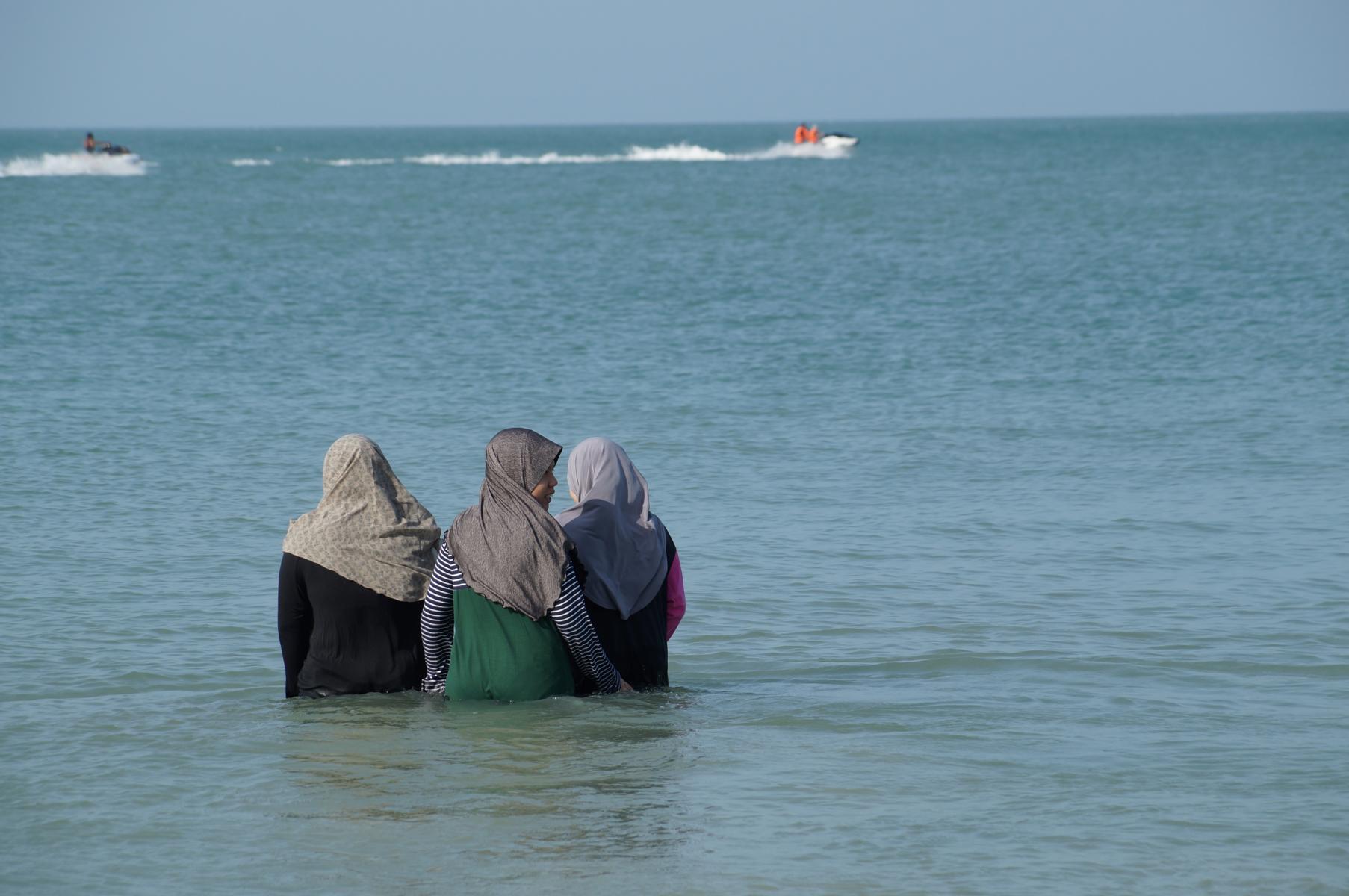 An der Beach gibt es immer Unterhaltung; eine ganze Sippe kommt zum Picknick. Immer wieder bringen sie uns Leckerbissen an den Tisch, so nett. Es ist herrlich, den Kindern und Frauen im Meer zuzuschauen, wie sie mit ihrem Schleier untertauchen, mit den Kindern spielen und ihren Spass haben.