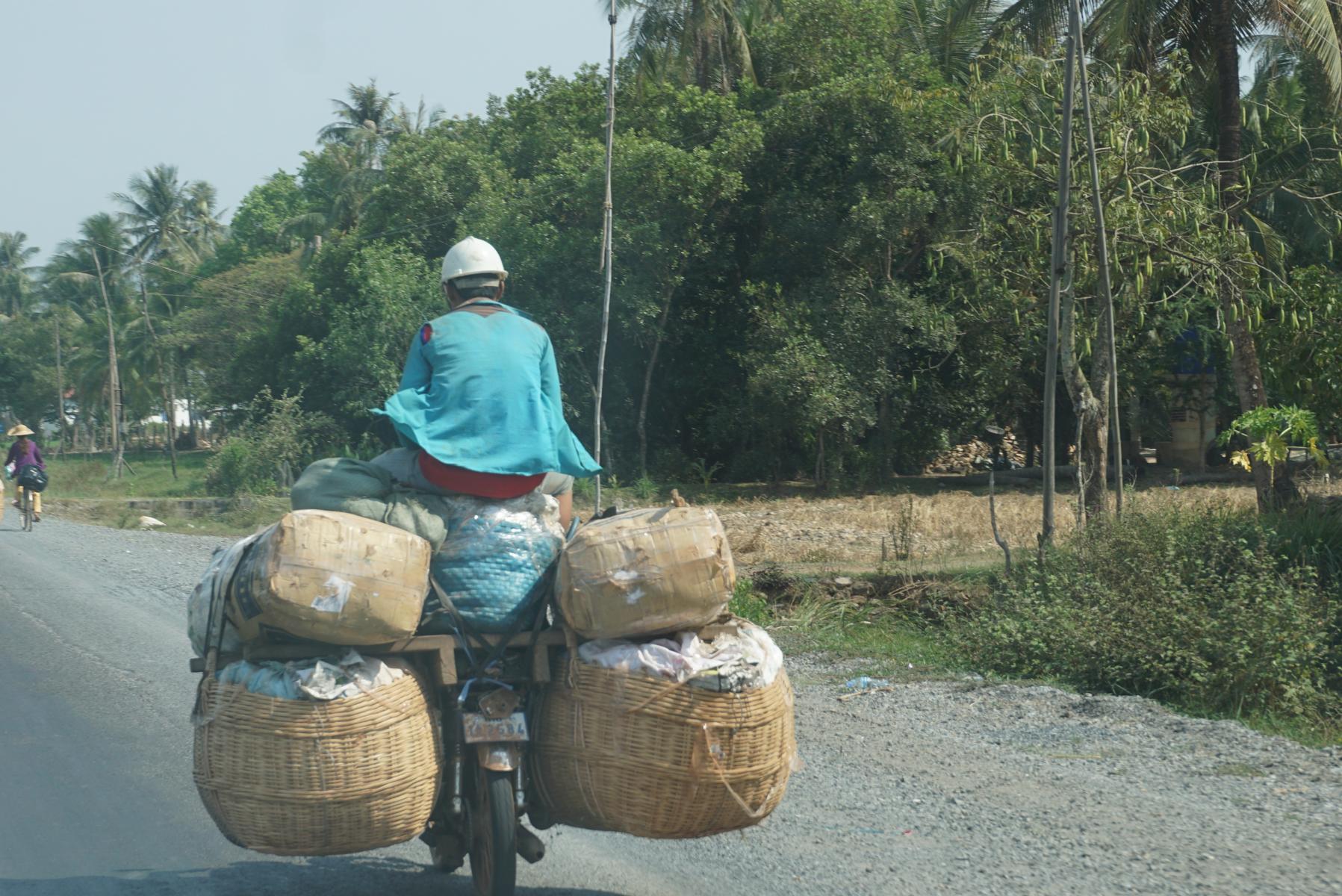 Ups, da ist ja Rechtsverkehr. Zum Glück, wie sich herausstellt. Schwer beladene Lastwagen, Kleinbusse gefüllt mit Leuten, Mopeds mit Familien drauf, Mopeds mit gefüllten, geflochtenen, in die Strasse hinein ragenden Bambuskörben auf jeder Seite müssen überholt werden. Hier hat Urs wieder den Blick nach vorne und ich kann mich vom Überholungskommando im Linksverkehr erholen.